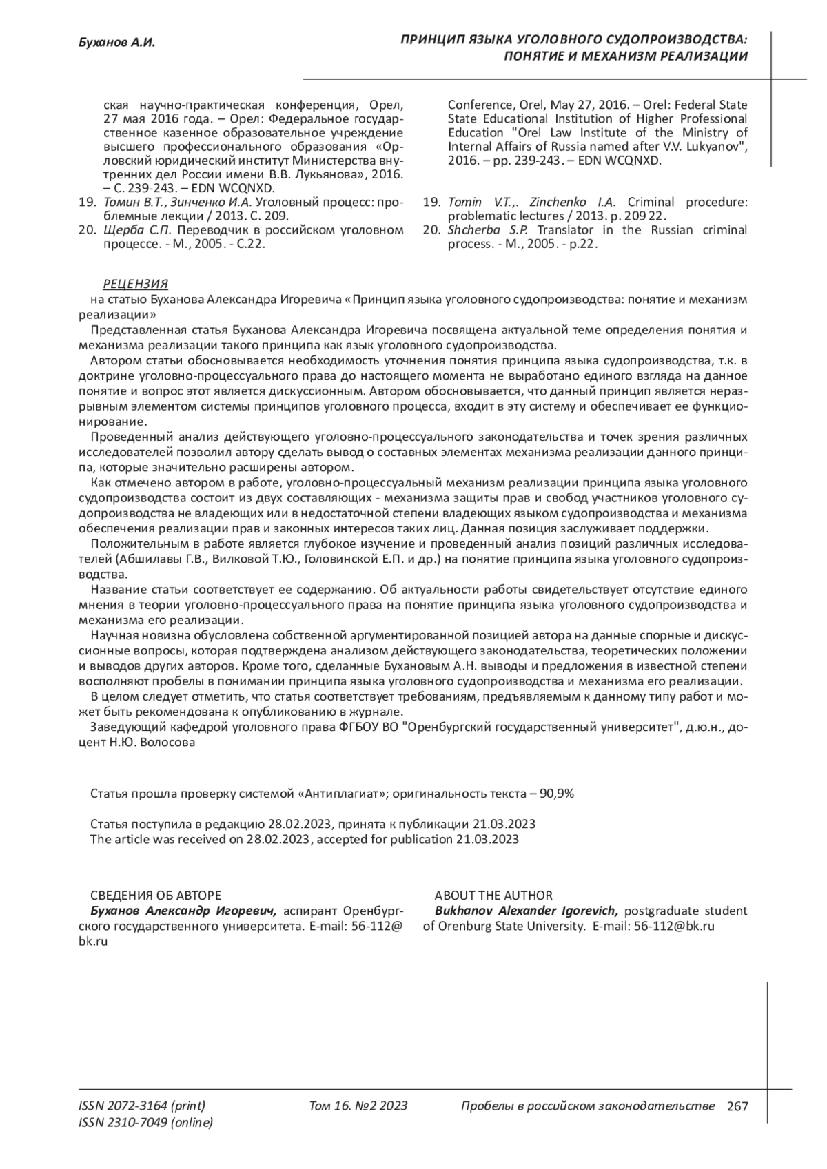 9. Жороев Н.Н. Принцип языка уголовного судопроизводства в системе принципов российского уголовного процесса // Образование. Наука, Научные кадры. - 2016. № 6. С. 51. EDN: XRIIVR