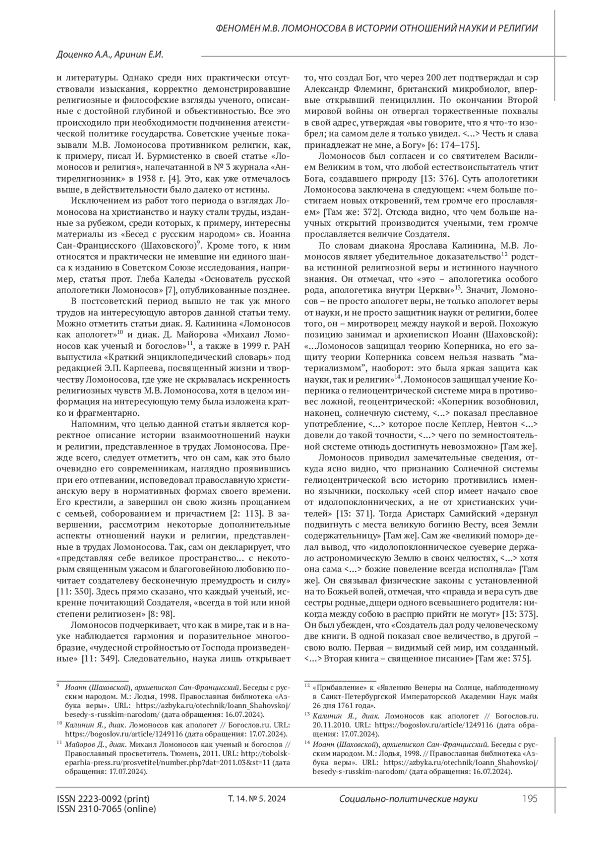 3. Аринин Е.И. Религия и М.В. Ломоносов // Михаил Ломоносов. Поморская энциклопедия. Архангельск: САФУ, 2022. С. 429.