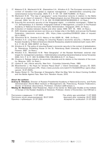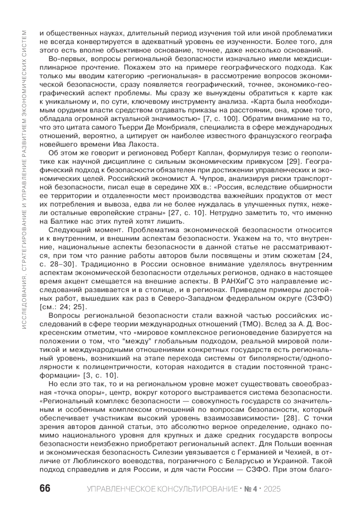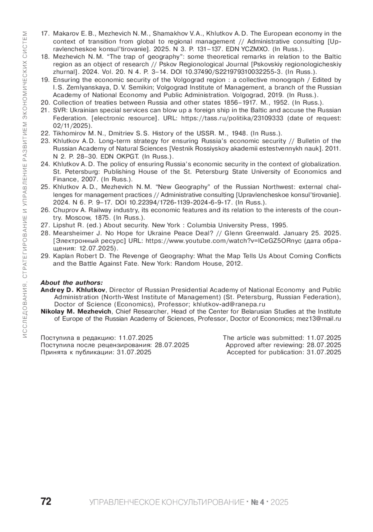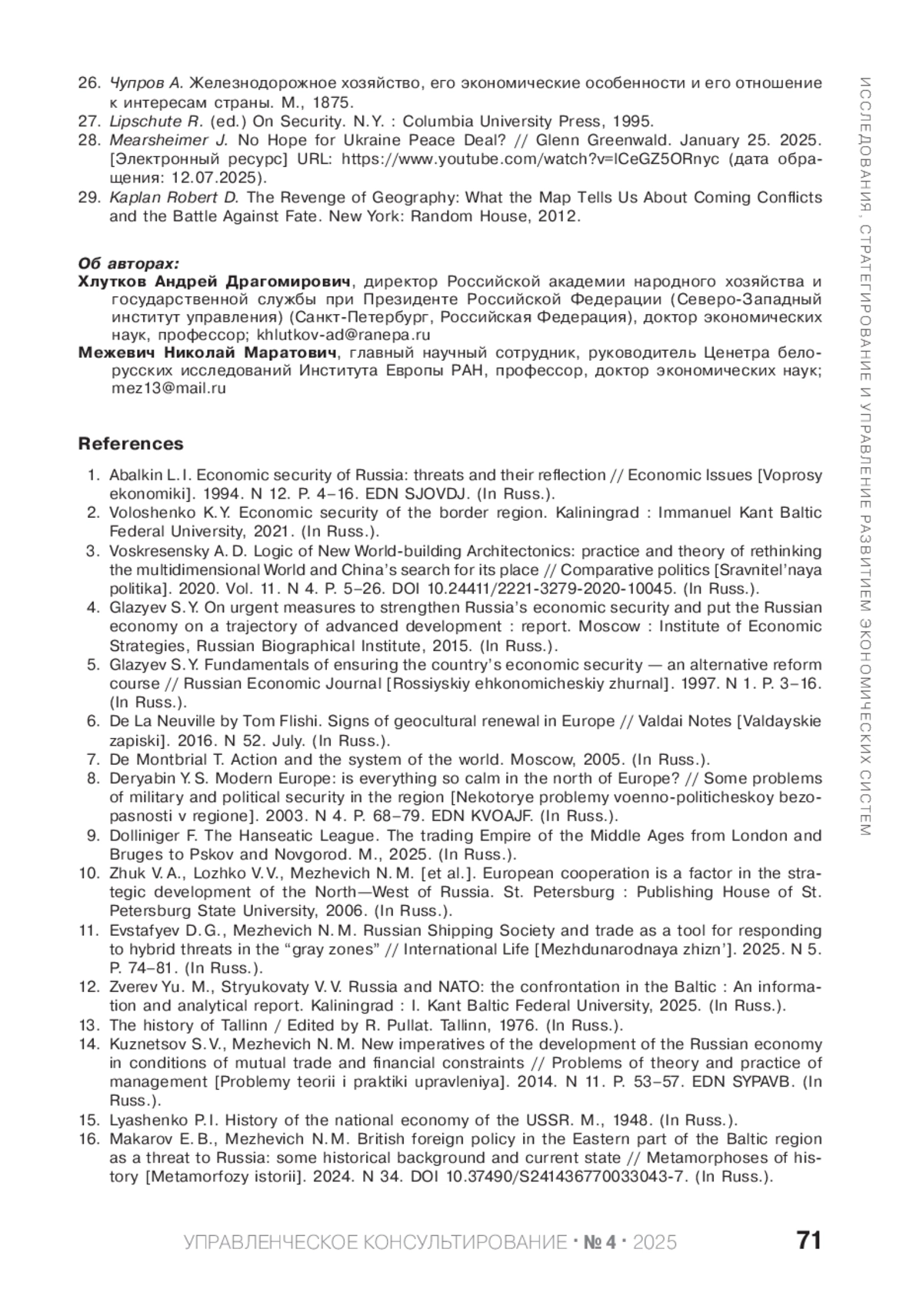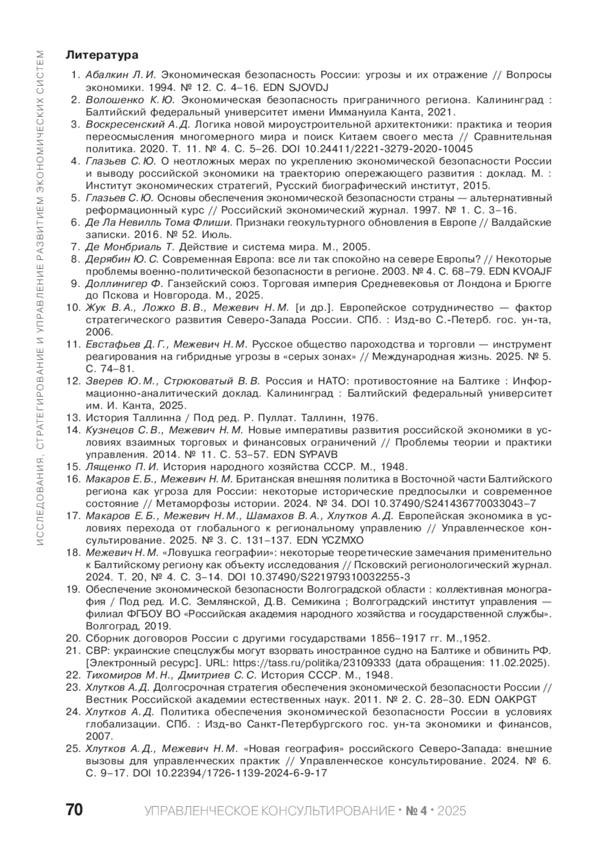 ХЛУТКОВ А. Д., МЕЖЕВИЧ Н. М. РЕГИОНАЛЬНАЯ ЭКОНОМИЧЕСКАЯ БЕЗОПАСНОСТЬ: НЕКОТОРЫЕ ВОПРОСЫ ТЕОРИИ И СПЕЦИФИКА ВНЕШНИХ УГРОЗ ДЛЯ РОССИЙСКОГО СЕВЕРО-ЗАПАДА // УПРАВЛЕНЧЕСКОЕ КОНСУЛЬТИРОВАНИЕ. 2025. № 4 (190)