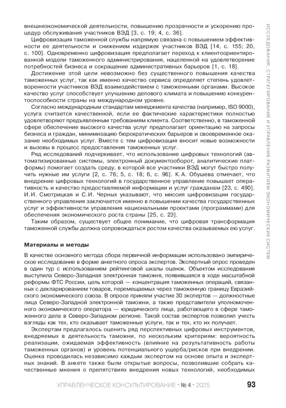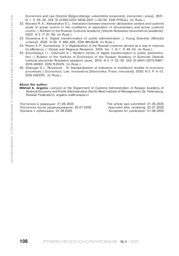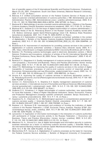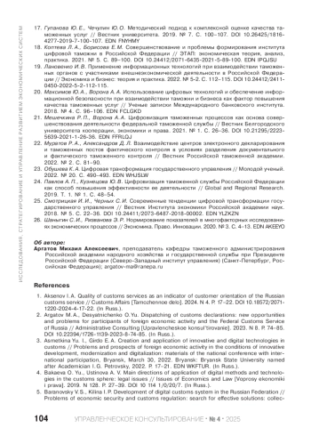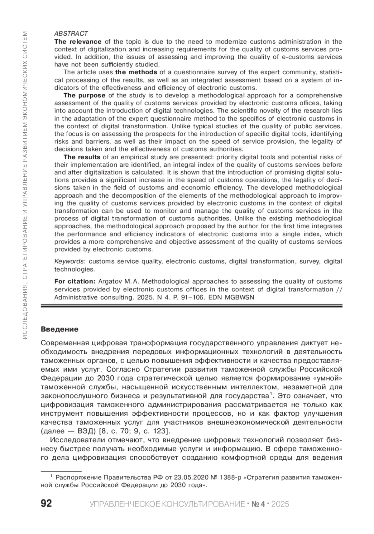 АРГАТОВ М. А. МЕТОДИЧЕСКИЕ ПОДХОДЫ К ОЦЕНКЕ КАЧЕСТВА ТАМОЖЕННЫХ УСЛУГ, ПРЕДОСТАВЛЯЕМЫХ ЭЛЕКТРОННЫМИ ТАМОЖНЯМИ, В УСЛОВИЯХ ЦИФРОВОЙ ТРАНСФОРМАЦИИ // УПРАВЛЕНЧЕСКОЕ КОНСУЛЬТИРОВАНИЕ. 2025. № 4 (190)