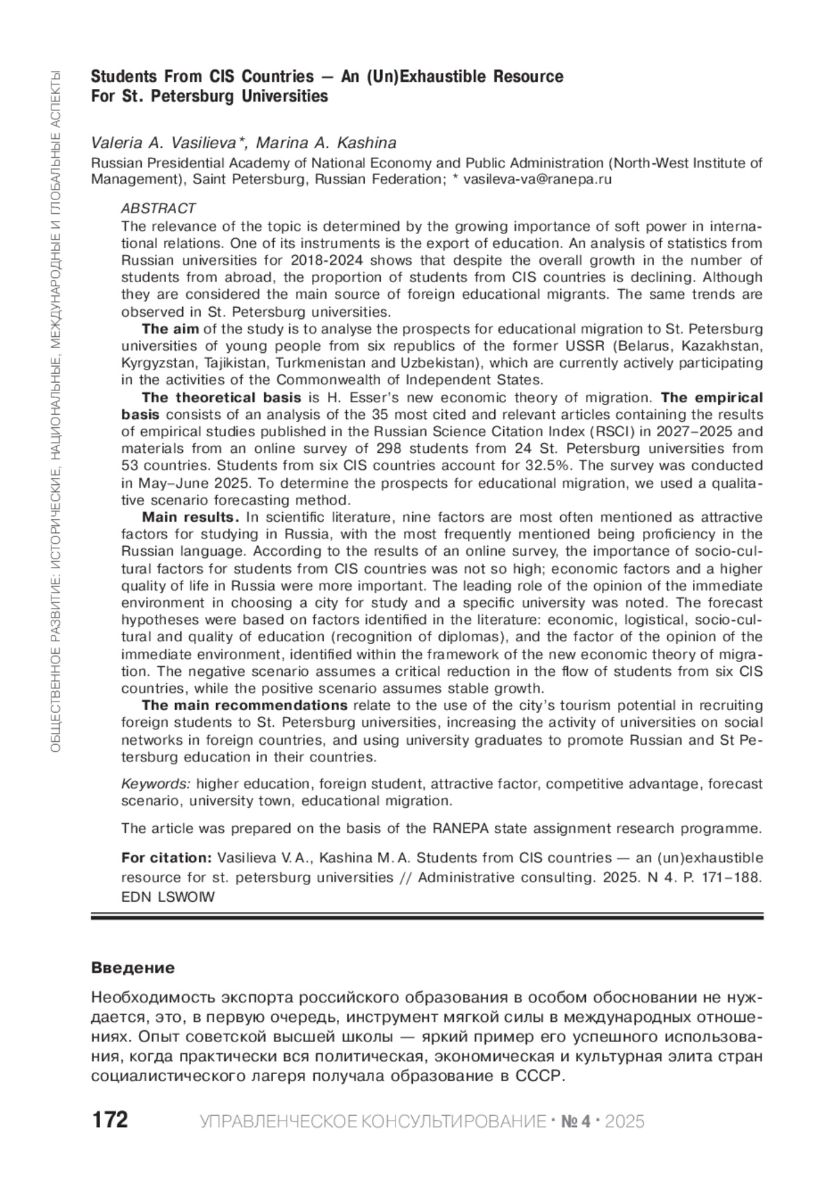 Основные результаты. В научной литературе в качестве привлекательных факторов обучения в России наиболее часто называются девять факторов, самый упоминаемый — фактор владения русским языком. По результатам онлайн-опроса значимость социокультурных факторов для студентов из стран СНГ оказалась не так высока, важнее экономические факторы и более высокое качество жизни в России. Зафиксирована ведущая роль мнения ближайшего окружения при выборе города для обучения и конкретного университета. Прогнозные гипотезы построены на основе факторов, выделенных в литературе, — экономического, логистического, социокультурного и качества образования (признание диплома), и фактора мнения ближайшего окружения, выделенного в рамках теории Х. Эссера. Негативный сценарий предполагает критическое сокращение потока студентов из шести стран СНГ в петербургские вузы, позитивный — стабильный рост их численности.