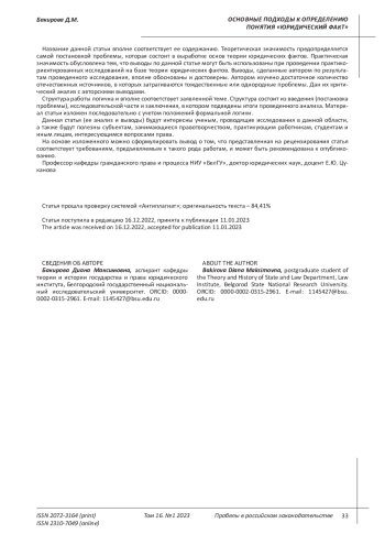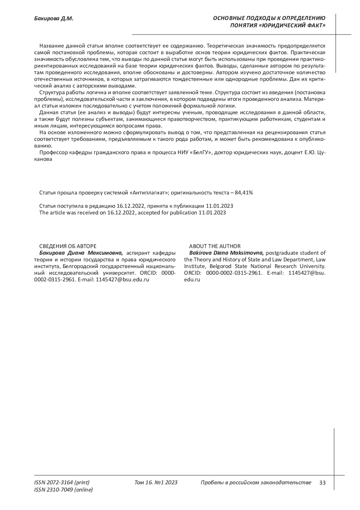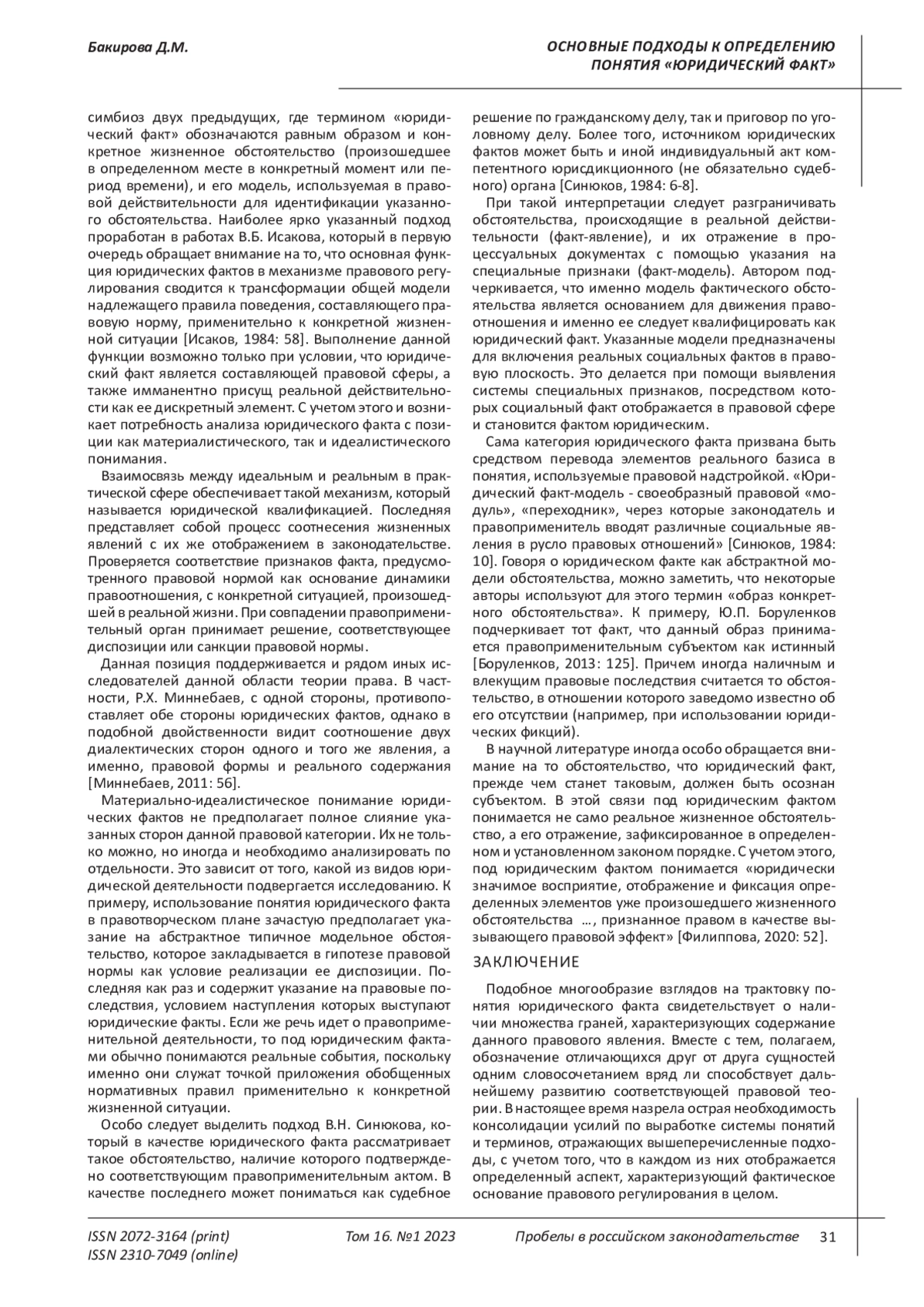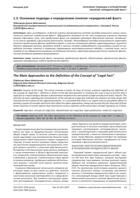БАКИРОВА Д. М. ОСНОВНЫЕ ПОДХОДЫ К ОПРЕДЕЛЕНИЮ ПОНЯТИЯ "ЮРИДИЧЕСКИЙ ФАКТ" // ПРОБЕЛЫ В РОССИЙСКОМ ЗАКОНОДАТЕЛЬСТВЕ. 2023. Т. 16 № 1