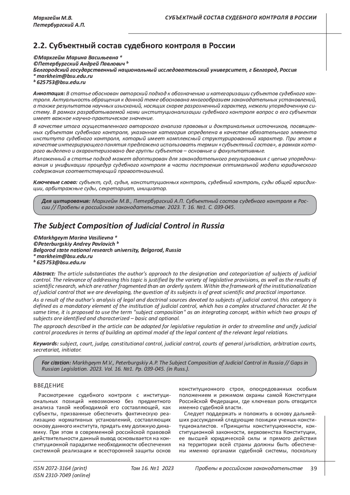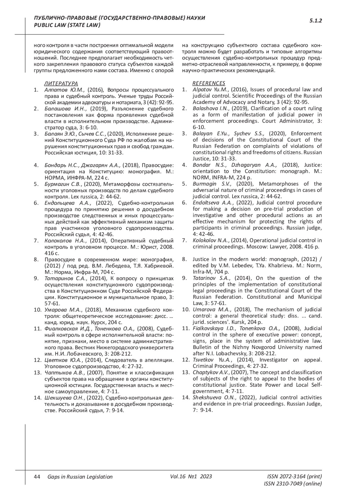 Alpatov Yu.M., (2016), Issues of procedural law and judicial control. Scientific Proceedings of the Russian Academy of Advocacy and Notary, 3 (42): 92-95.