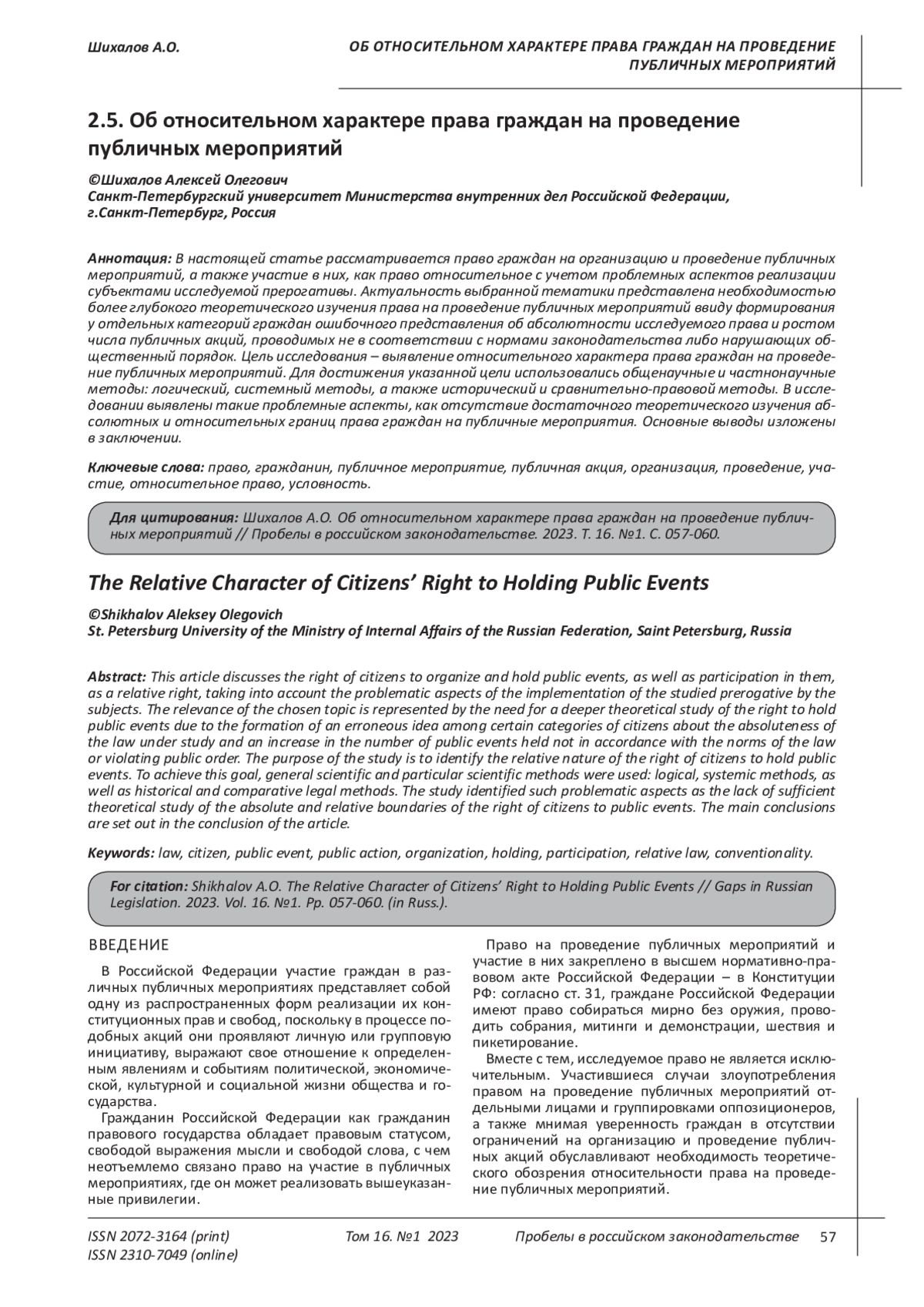 Antonova L.B., Kashirina Yu.P. The right of citizens to hold public events: the concept, content and prospects of legal regulation [Text] / L.B. Antonova, Yu.P. Kashirina // Territory of Science. 2013. No. 5. P. 70.