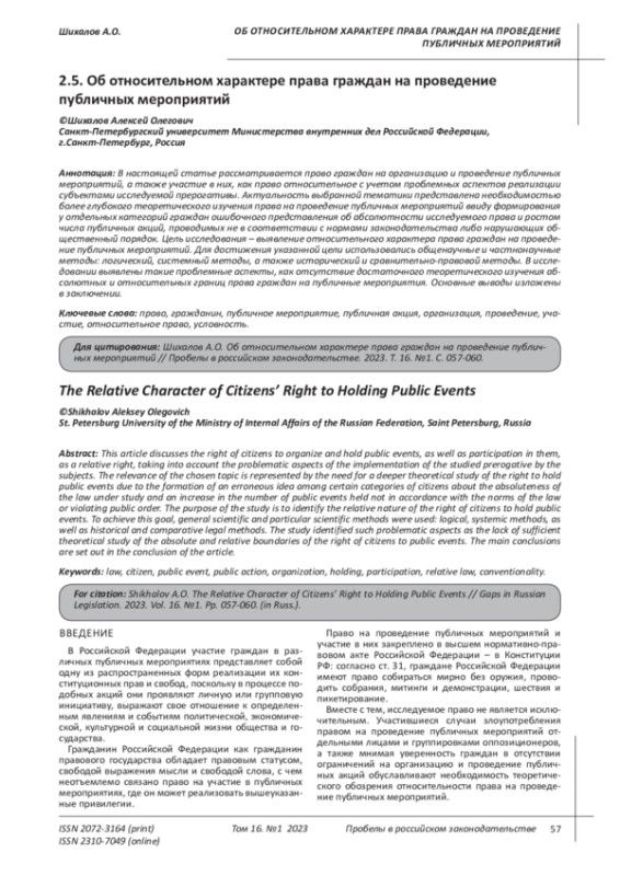 В настоящей статье рассматривается право граждан на организацию и проведение публичных мероприятий, а также участие в них, как право относительное с учетом проблемных аспектов реализации субъектами исследуемой прерогативы. Актуальность выбранной тематики представлена необходимостью более глубокого теоретического изучения права на проведение публичных мероприятий ввиду формирования у отдельных категорий граждан ошибочного представления об абсолютности исследуемого права и ростом числа публичных акций, проводимых не в соответствии с нормами законодательства либо нарушающих общественный порядок. Цель исследования - выявление относительного характера права граждан на проведение публичных мероприятий. Для достижения указанной цели использовались общенаучные и частнонаучные методы: логический, системный методы, а также исторический и сравнительно-правовой методы. В исследовании выявлены такие проблемные аспекты, как отсутствие достаточного теоретического изучения абсолютных и относительных границ права граждан на публичные мероприятия. Основные выводы изложены в заключении.