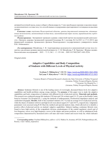 Результаты. Средний уровень двигательной активности выявлен у половины обследованных (56,3 %), доли студентов с низким и высоким уровнями двигательной активности были почти равны (19,7 и 24,0 % соответственно). Оценивались показатели адаптации по методу Р. М. Баевского и по данным спектрального анализа вариабельности сердечного ритма, что позволило установить положительное влияние физической активности на адаптационные возможности студентов. У испытуемых, ведущих малоподвижный образ жизни, определены высокая активность симпатического отдела, преобладание центрального контура регуляции и низкочастотных волн над высокочастотными в клино- и ортоположении, несбалансированный состав тела, характеризующийся снижением активной клеточной массы и содержания воды на фоне избыточной жировой массы тела, что свидетельствует о низких адаптационных возможностях. У физически активных студентов определены минимальная централизация управления сердечным ритмом, преобладающее влияние автономного контура регуляции и высокочастотных волн над низкочастотными, более высокая активность парасимпатического отдела. При ортостатической пробе снижение общей мощности спектра у них происходило на фоне уменьшения активности парасимпатического отдела. Физически активные студенты имели более низкие значения жировой массы тела и более высокие показатели активной клеточной массы, воды и общего обмена веществ. У них преобладали хорошие и высокие индексы компонентного состава тела, что способствовало поддержанию адаптационного потенциала на высоком уровне.
