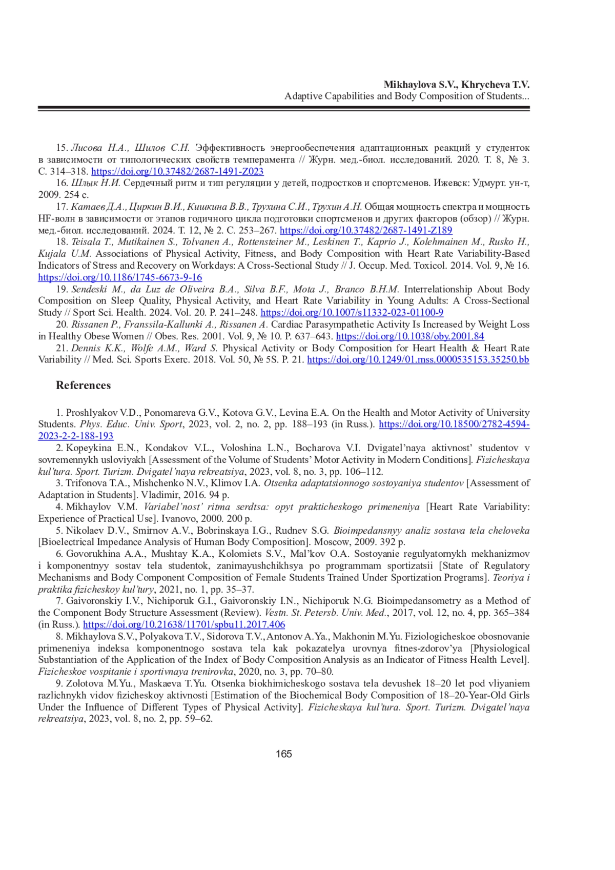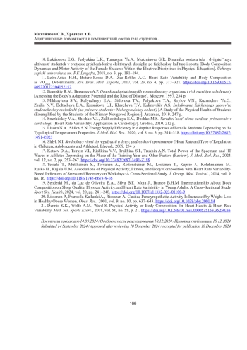 6. Говорухина А.А., Муштай К.А., Коломиец С.В., Мальков О.А. Состояние регуляторных механизмов и компонентный состав тела студенток, занимающихся по программам спортизации // Теория и практика физ. культуры. 2021. No 1. С. 35-37. EDN: AMJJRI