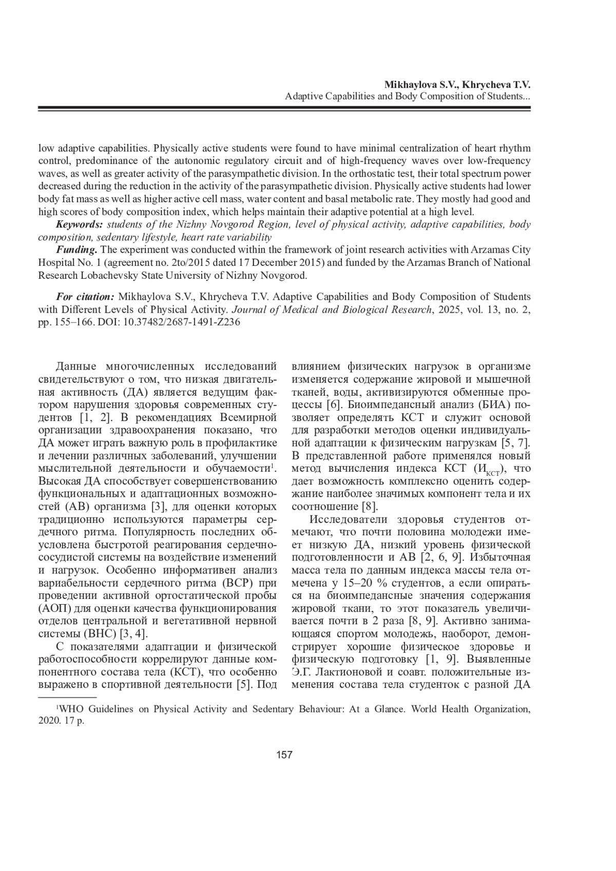 21. Dennis K.K., Wolfe A.M., Ward S. Physical Activity or Body Composition for Heart Health & Heart Rate Variability // Med. Sci. Sports Exerc. 2018. Vol. 50, No 5S. P. 21. DOI: 10.1249/01.mss.0000535153.35250.bb