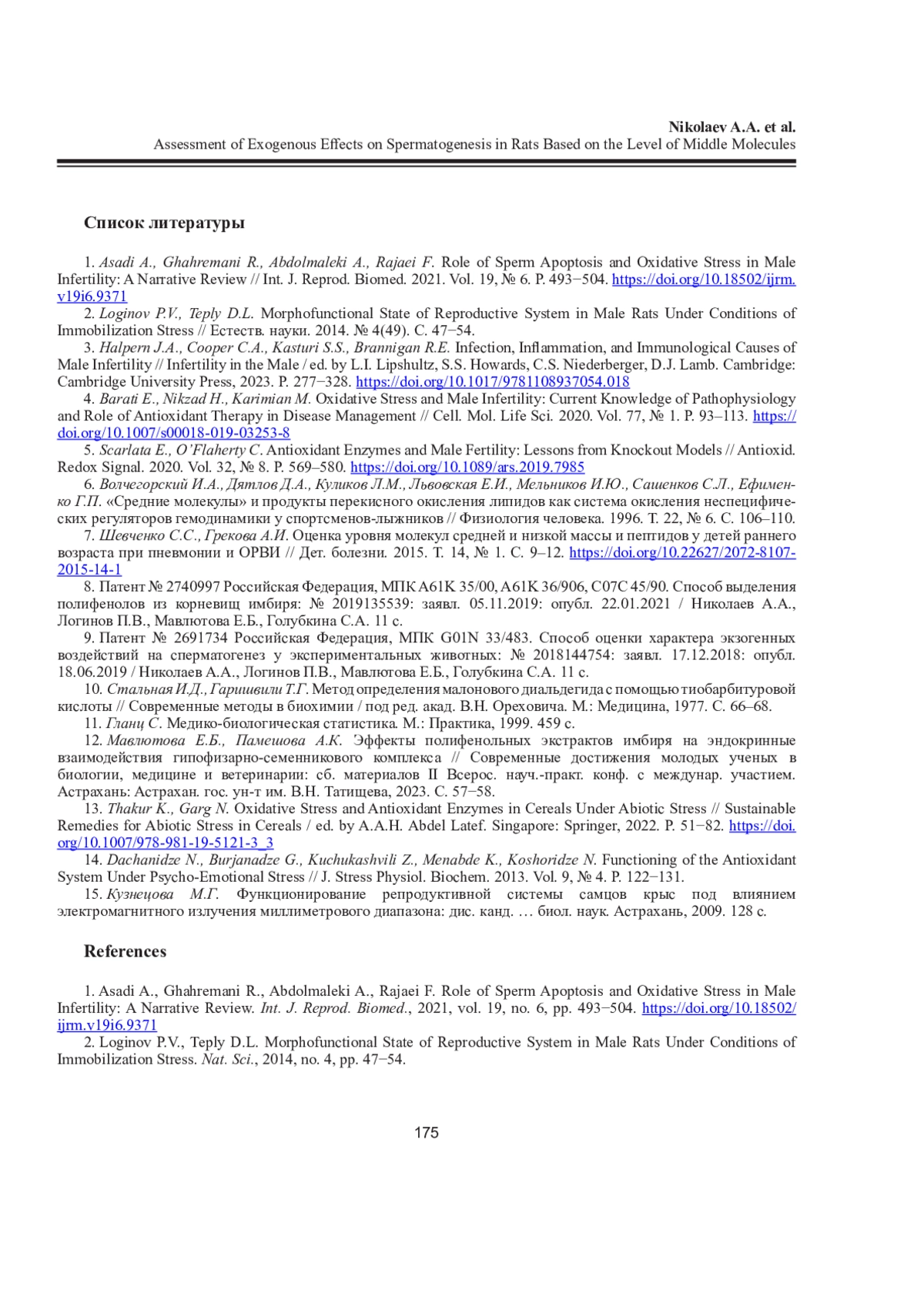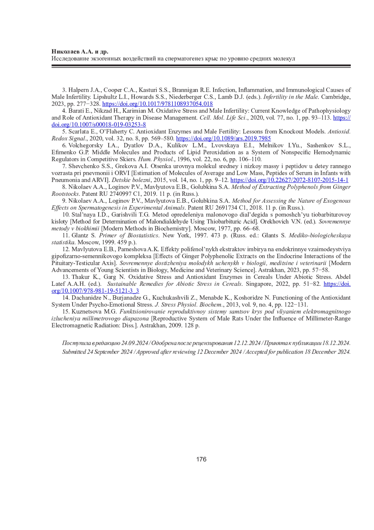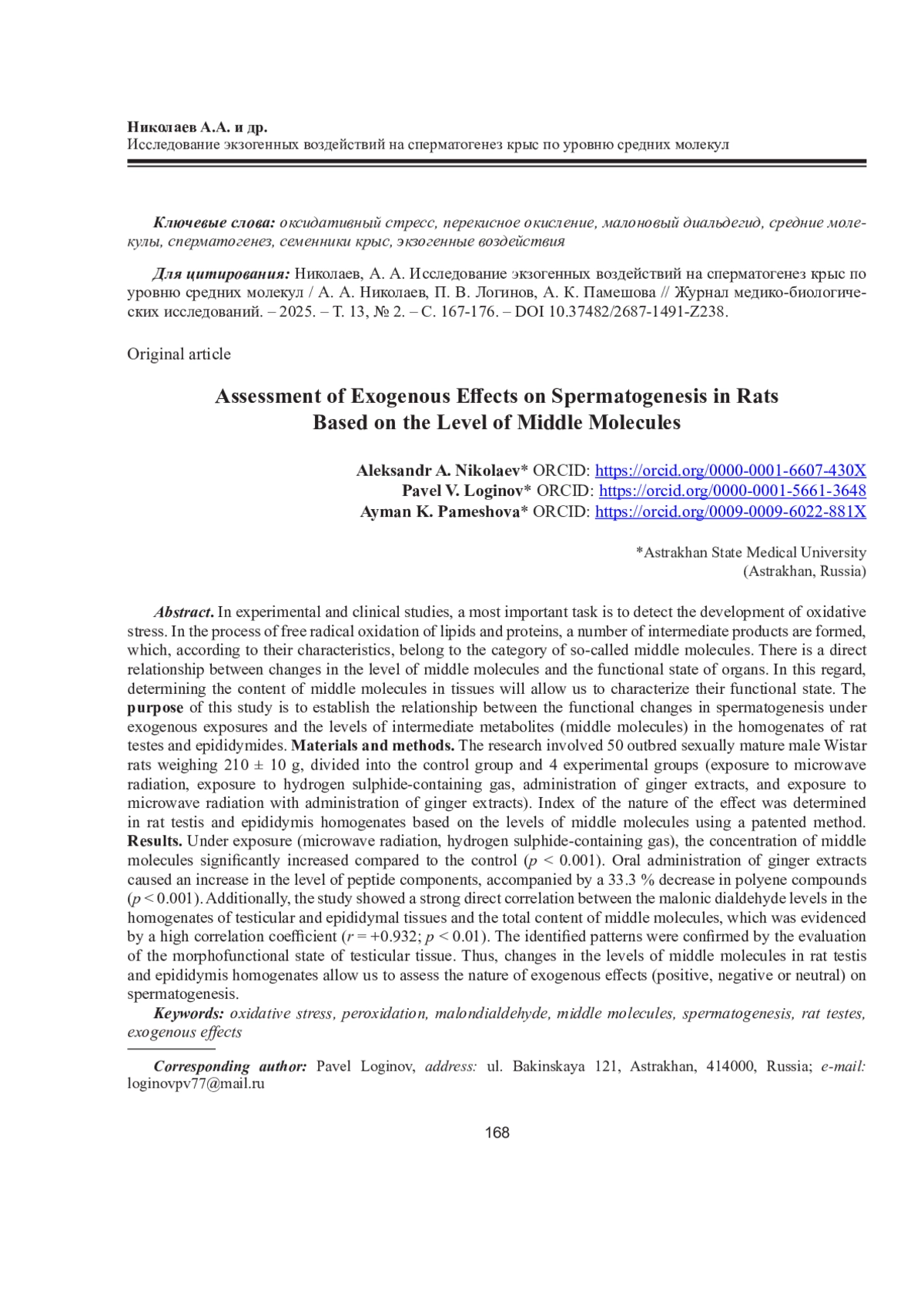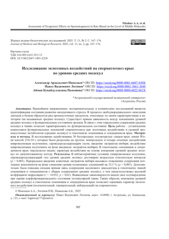 НИКОЛАЕВ А. А., ЛОГИНОВ П. В., ПАМЕШОВА А. К. ИССЛЕДОВАНИЕ ЭКЗОГЕННЫХ ВОЗДЕЙСТВИЙ НА СПЕРМАТОГЕНЕЗ КРЫС ПО УРОВНЮ СРЕДНИХ МОЛЕКУЛ // ЖУРНАЛ МЕДИКО-БИОЛОГИЧЕСКИХ ИССЛЕДОВАНИЙ. 2025. Т. 13 № 2