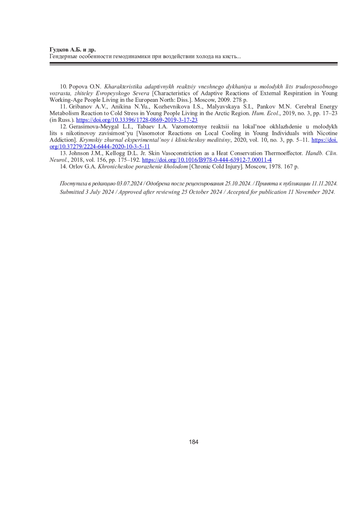 7. Аверьянова И.В. Ответные реакции кардиогемодинамики при локальном холодовом воздействии у жителей приморской и континентальной зон Магаданской области // Экология человека. 2021. No 10. С. 29-36. DOI: 10.33396/1728-0869-2021-10-29-36 EDN: TRHBKE