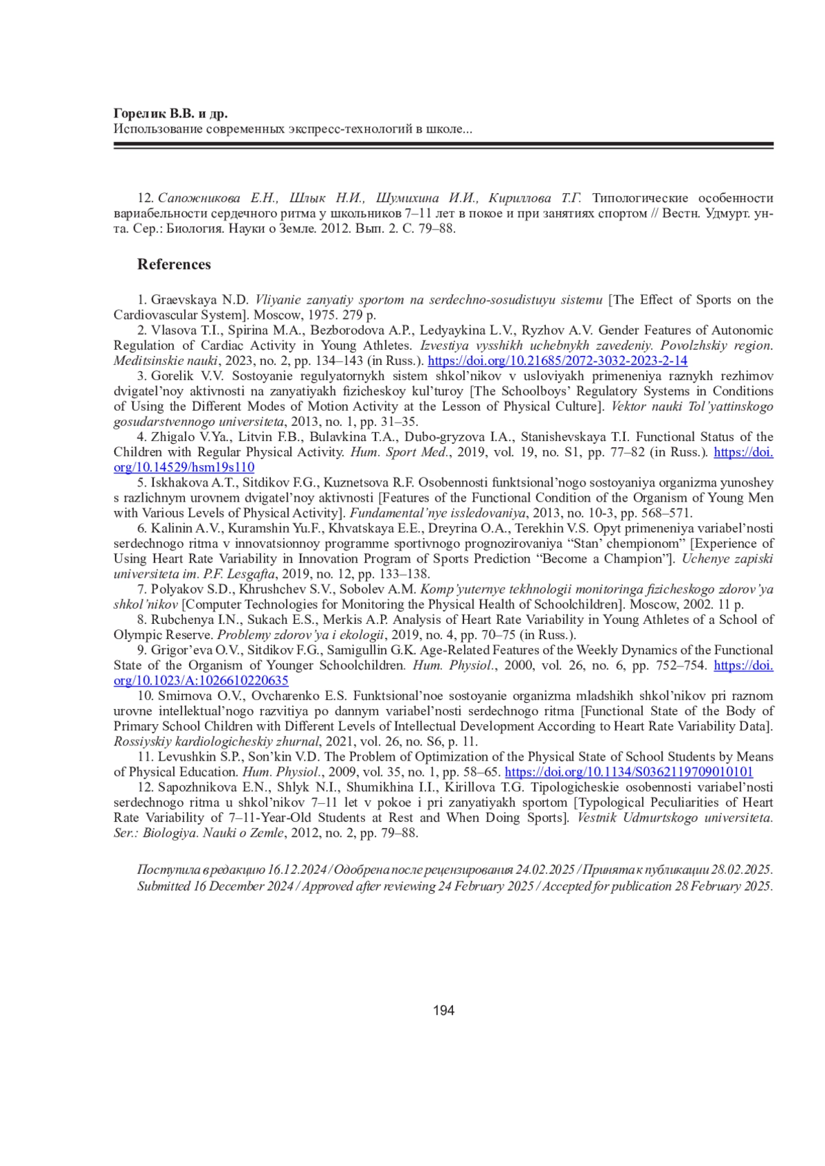 12. Сапожникова Е.Н., Шлык Н.И., Шумихина И.И., Кириллова Т.Г. Типологические особенности вариабельности сердечного ритма у школьников 7-11 лет в покое и при занятиях спортом // Вестн. Удмурт. унта. Сер.: Биология. Науки о Земле. 2012. Вып. 2. С. 79-88.