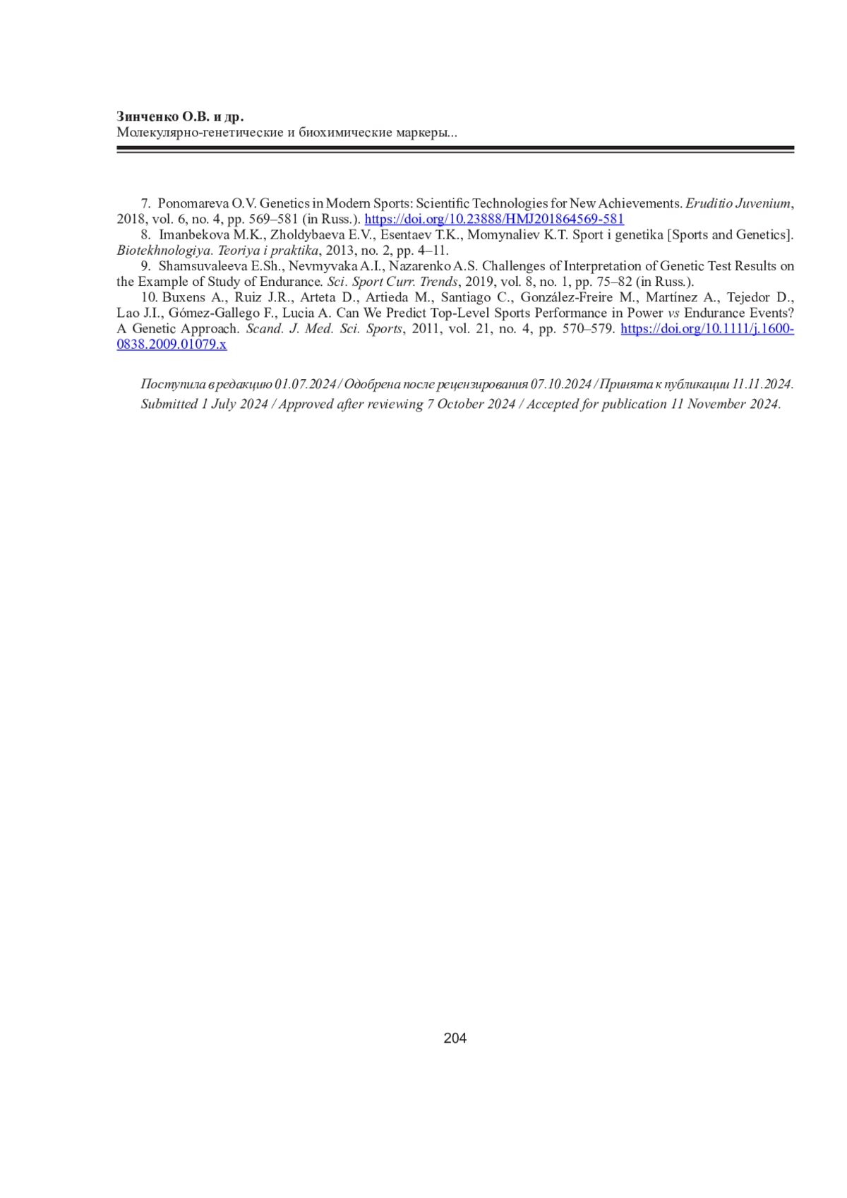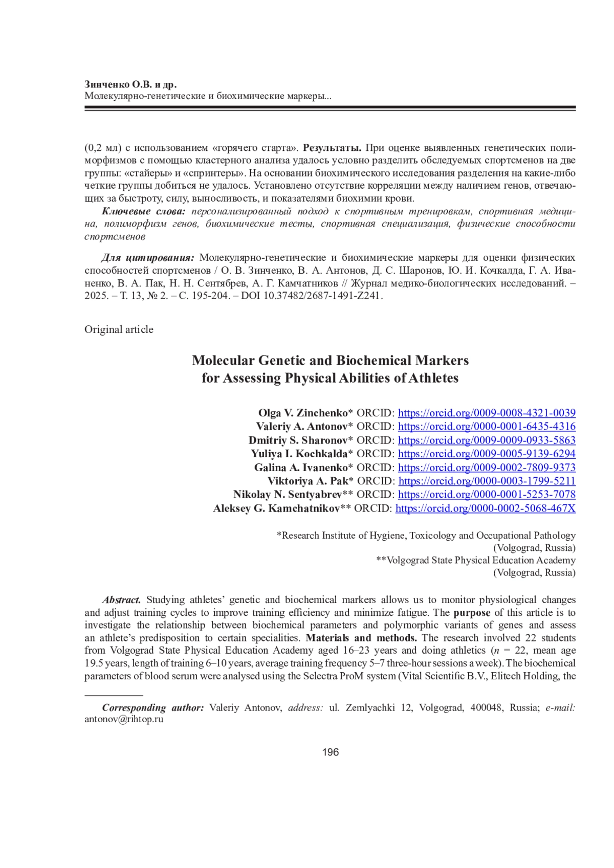 ЗИНЧЕНКО О. В., АНТОНОВ В. А., ШАРОНОВ Д. С., КОЧКАЛДА Ю. И., ИВАНЕНКО Г. А., ПАК В. А., СЕНТЯБРЕВ Н. Н., КАМЧАТНИКОВ А. Г. МОЛЕКУЛЯРНО-ГЕНЕТИЧЕСКИЕ И БИОХИМИЧЕСКИЕ МАРКЕРЫ ДЛЯ ОЦЕНКИ ФИЗИЧЕСКИХ СПОСОБНОСТЕЙ СПОРТСМЕНОВ // ЖУРНАЛ МЕДИКО-БИОЛОГИЧЕСКИХ ИССЛЕДОВАНИЙ. 2025. Т. 13 № 2