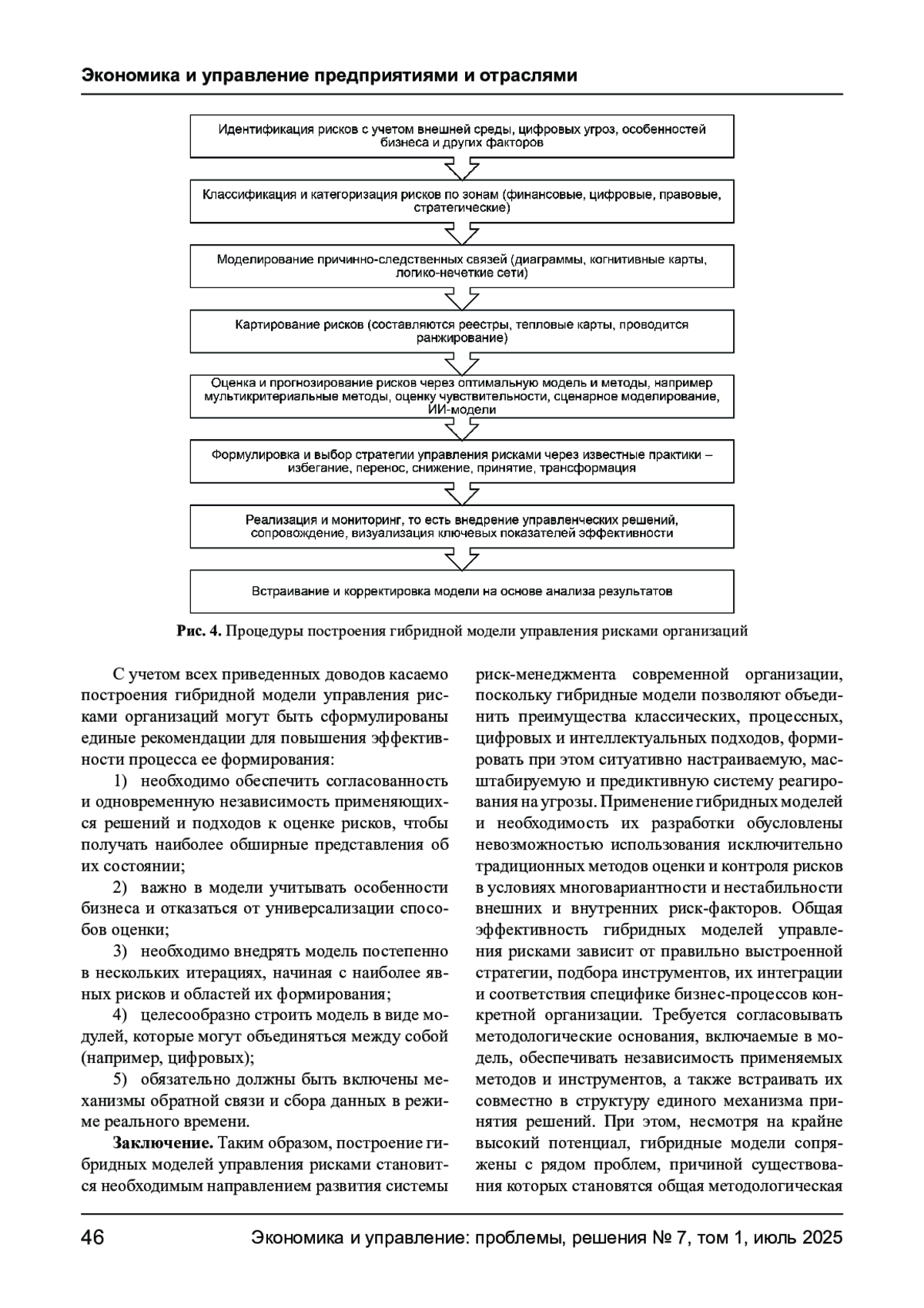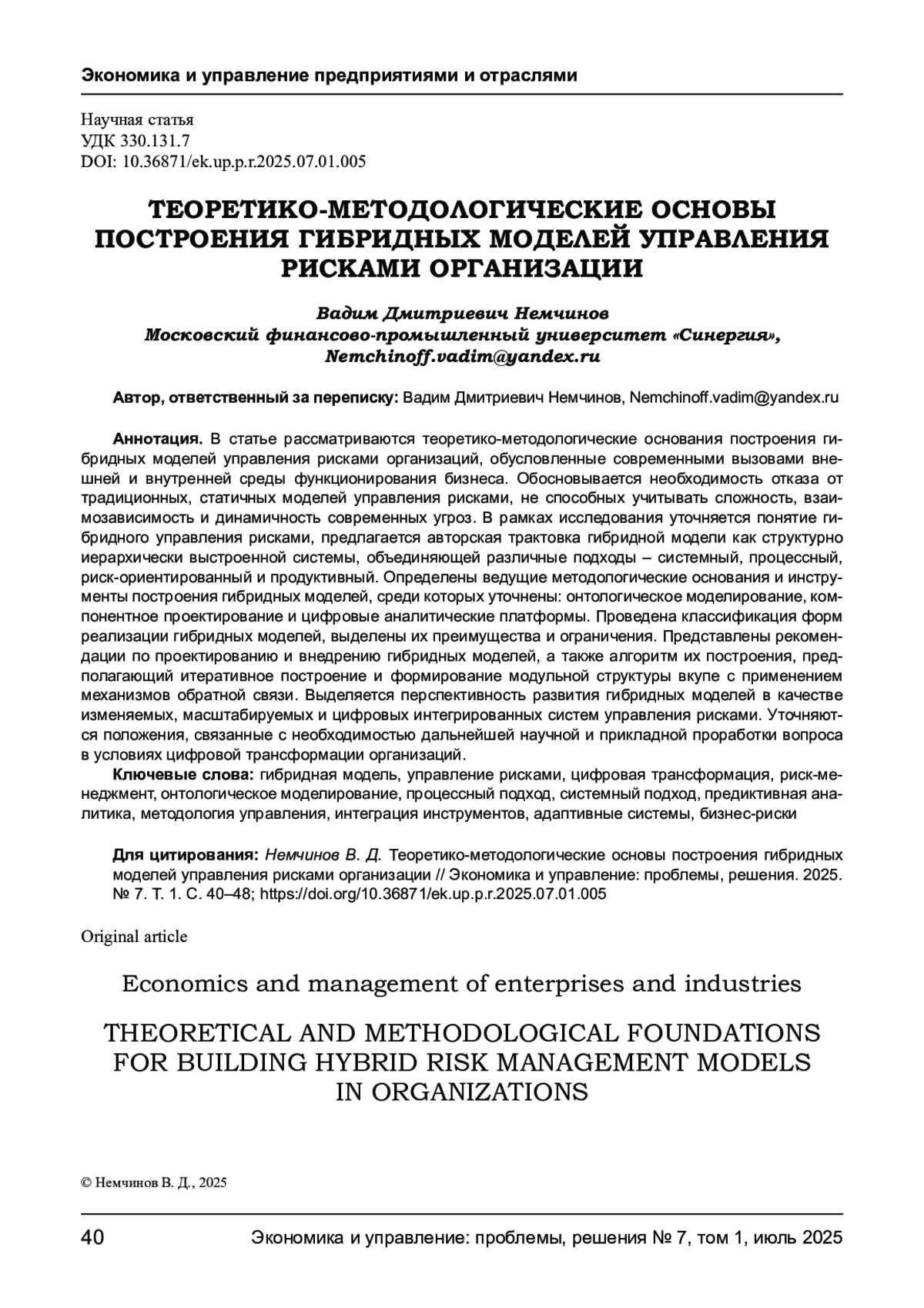В статье рассматриваются теоретико-методологические основания построения гибридных моделей управления рисками организаций, обусловленные современными вызовами внешней и внутренней среды функционирования бизнеса. Обосновывается необходимость отказа от традиционных, статичных моделей управления рисками, не способных учитывать сложность, взаимозависимость и динамичность современных угроз. В рамках исследования уточняется понятие гибридного управления рисками, предлагается авторская трактовка гибридной модели как структурно иерархически выстроенной системы, объединяющей различные подходы - системный, процессный, риск-ориентированный и продуктивный. Определены ведущие методологические основания и инструменты построения гибридных моделей, среди которых уточнены: онтологическое моделирование, компонентное проектирование и цифровые аналитические платформы. Проведена классификация форм реализации гибридных моделей, выделены их преимущества и ограничения. Представлены рекомендации по проектированию и внедрению гибридных моделей, а также алгоритм их построения, предполагающий итеративное построение и формирование модульной структуры вкупе с применением механизмов обратной связи. Выделяется перспективность развития гибридных моделей в качестве изменяемых, масштабируемых и цифровых интегрированных систем управления рисками. Уточняются положения, связанные с необходимостью дальнейшей научной и прикладной проработки вопроса в условиях цифровой трансформации организаций.