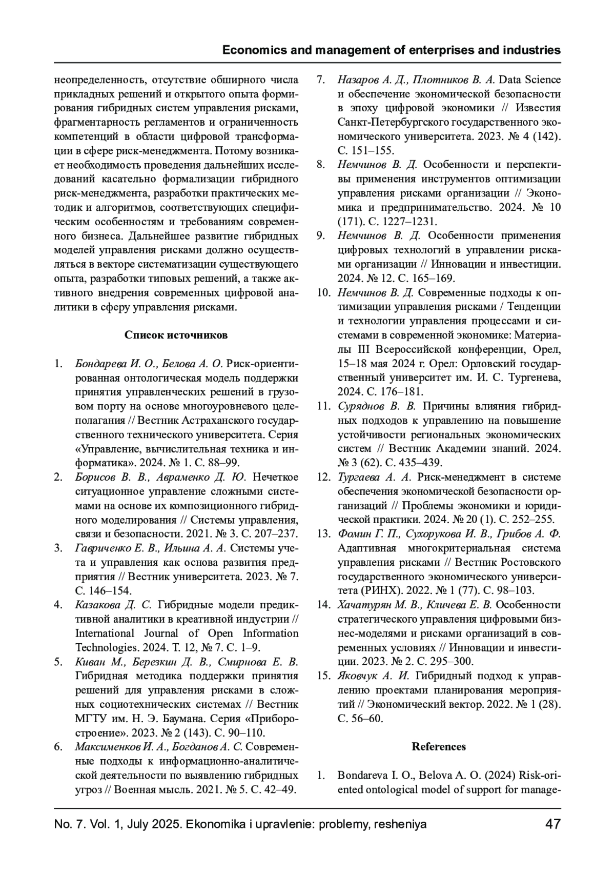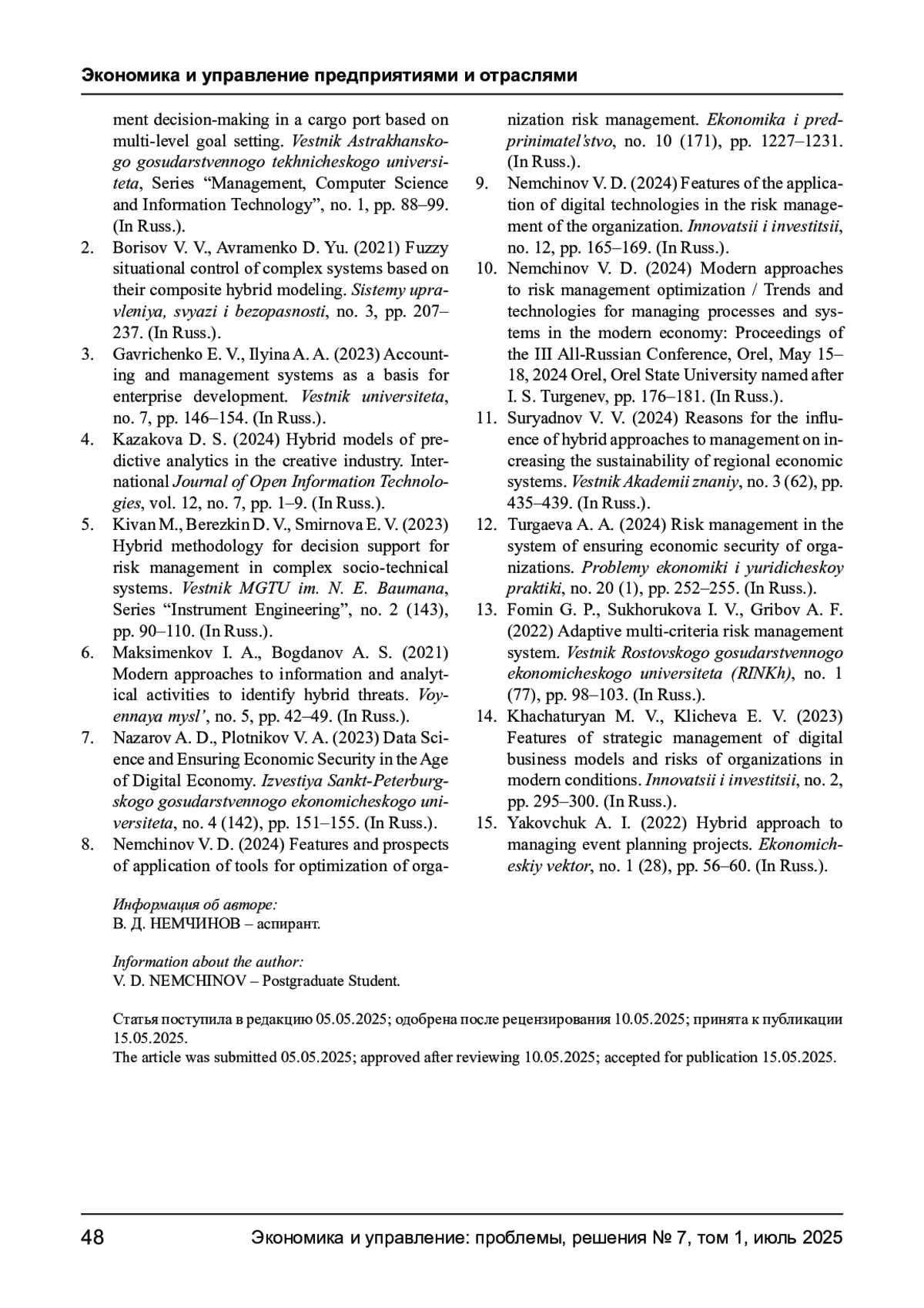 10. Немчинов В. Д. Современные подходы к оптимизации управления рисками / Тенденции и технологии управления процессами и системами в современной экономике: Материалы III Всероссийской конференции, Орел, 15-18 мая 2024 г. Орел: Орловский государственный университет им. И. С. Тургенева, 2024. С. 176-181. EDN: RDJLTU