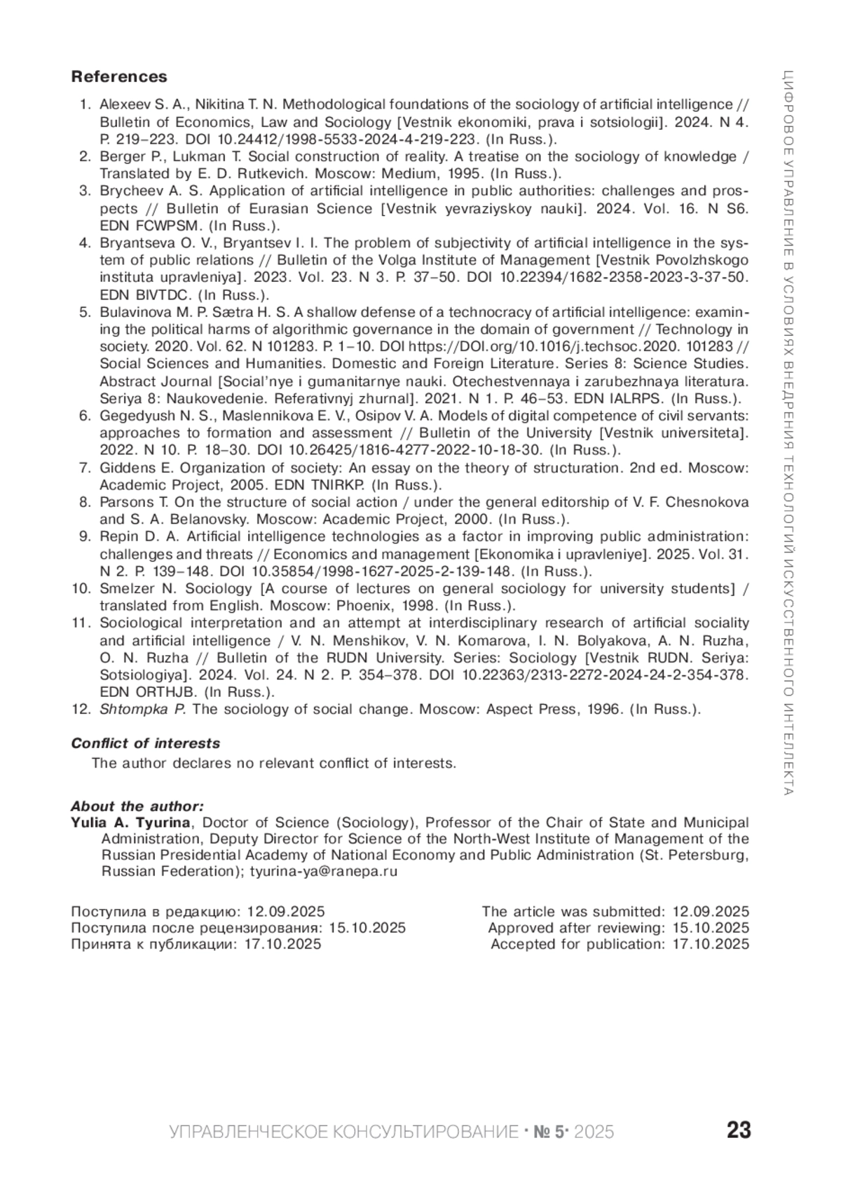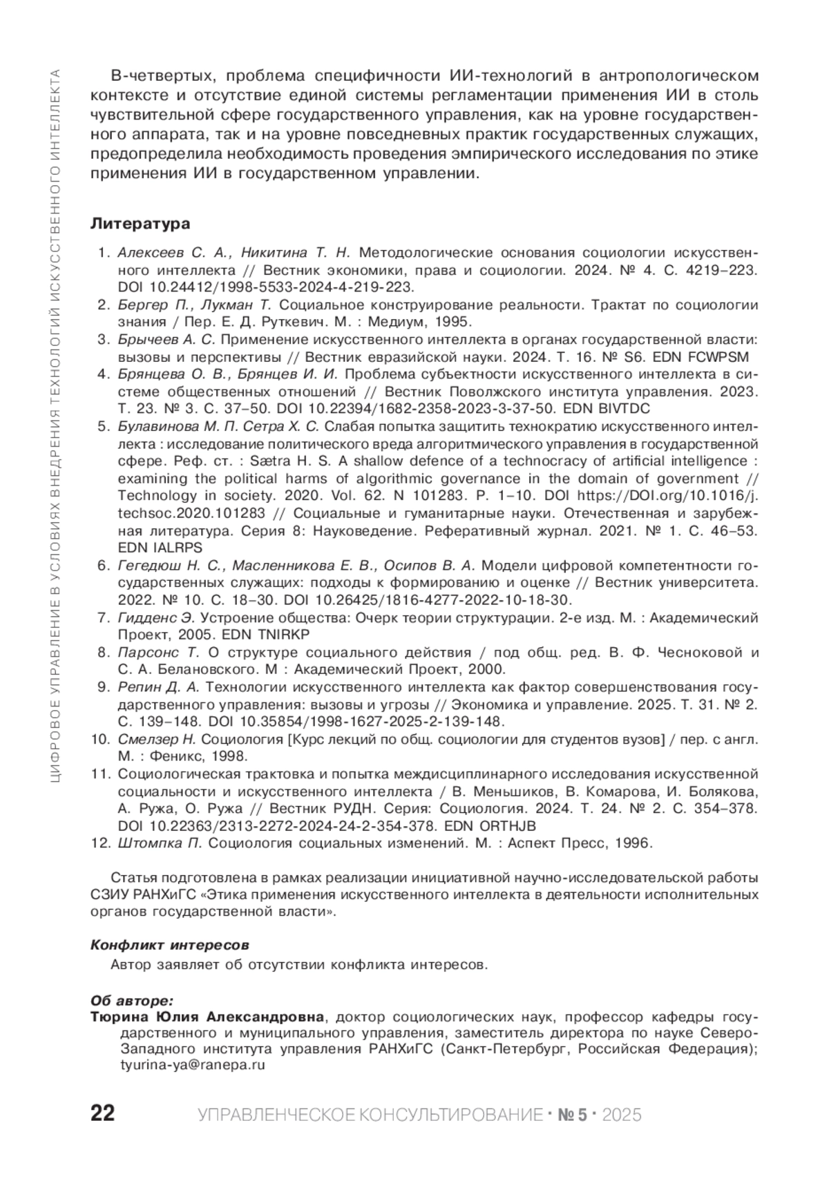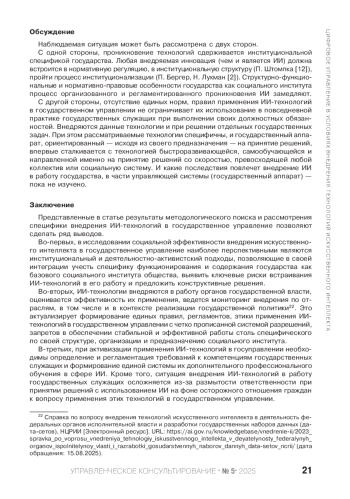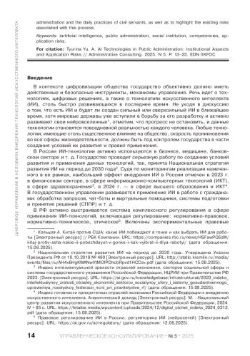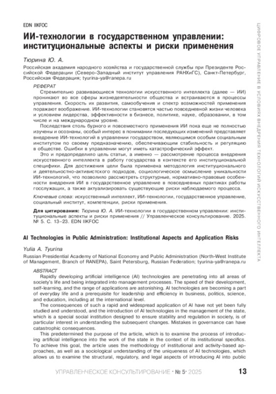 ТЮРИНА Ю. А. ИИ-ТЕХНОЛОГИИ В ГОСУДАРСТВЕННОМ УПРАВЛЕНИИ: ИНСТИТУЦИОНАЛЬНЫЕ АСПЕКТЫ И РИСКИ ПРИМЕНЕНИЯ // УПРАВЛЕНЧЕСКОЕ КОНСУЛЬТИРОВАНИЕ. 2025. № 5 (191)