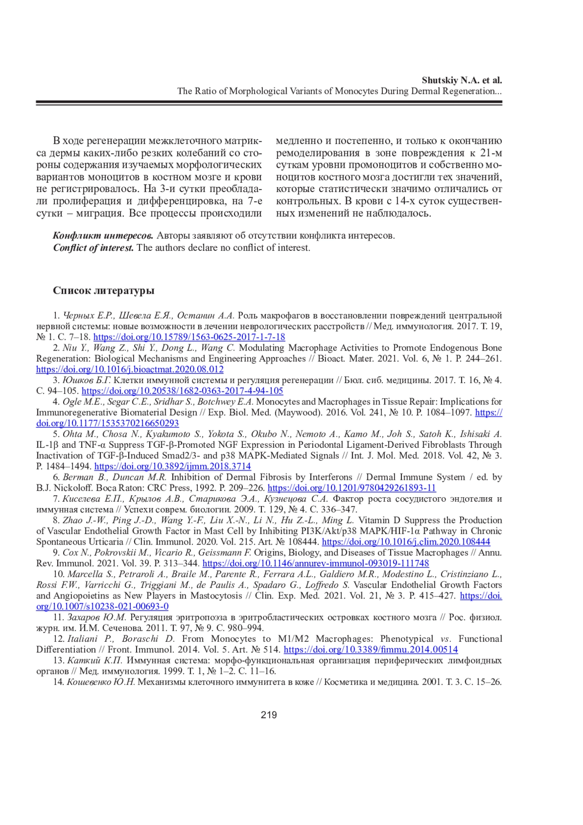 3. Юшков Б.Г. Клетки иммунной системы и регуляция регенерации // Бюл. сиб. медицины. 2017. Т. 16, No 4. С. 94-105. DOI: 10.20538/1682-0363-2017-4-94-105 EDN: YQMYBO