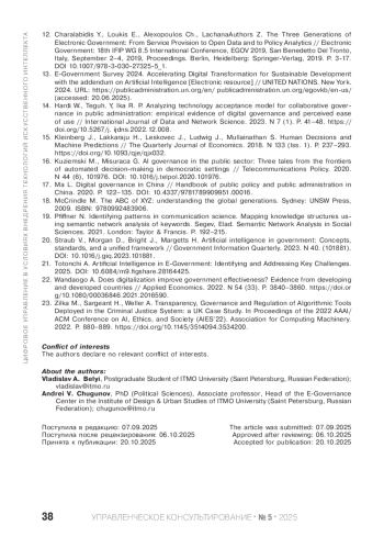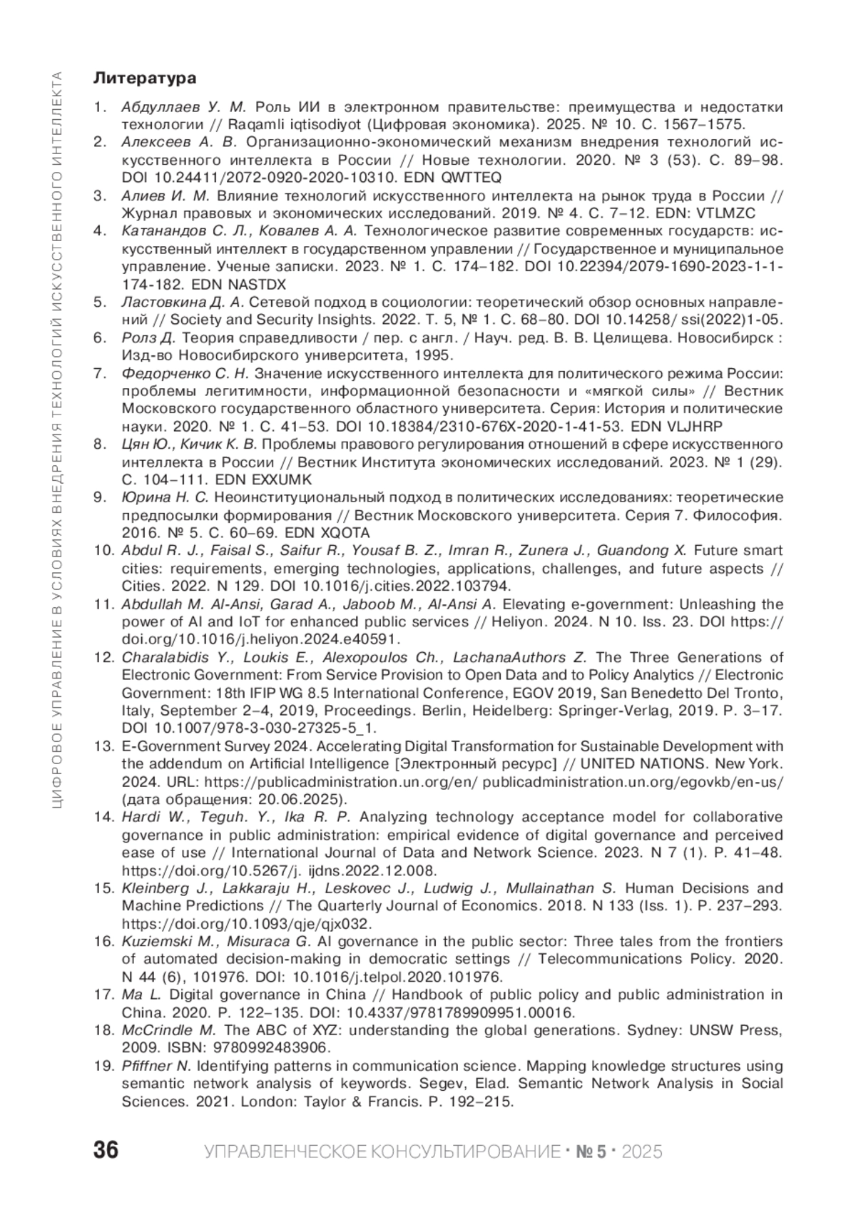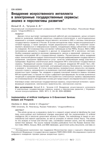 БЕЛЫЙ В. А., ЧУГУНОВ А. В. ВНЕДРЕНИЕ ИСКУССТВЕННОГО ИНТЕЛЛЕКТА В ЭЛЕКТРОННЫЕ ГОСУДАРСТВЕННЫЕ СЕРВИСЫ: АНАЛИЗ И ПЕРСПЕКТИВЫ РАЗВИТИЯ // УПРАВЛЕНЧЕСКОЕ КОНСУЛЬТИРОВАНИЕ. 2025. № 5 (191)