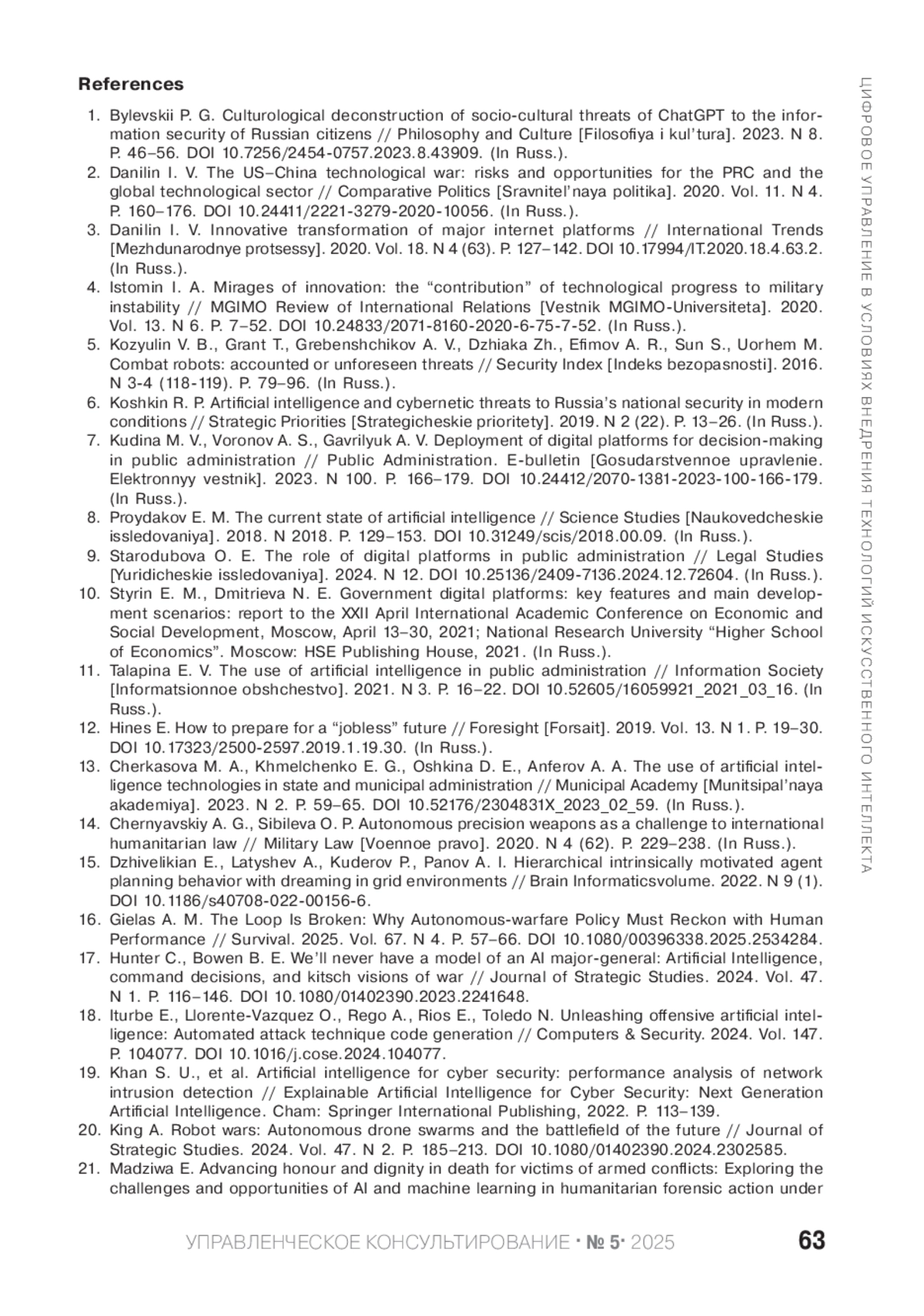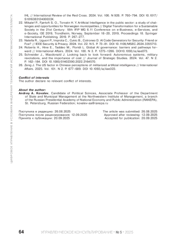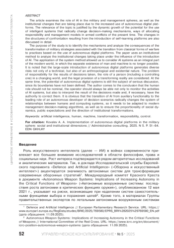 В статье рассматривается роль ИИ в военной и управленческой сферах, а также институциональные изменения, которые имеют место вследствие расширения использования автономных цифровых платформ. Обоснование актуальности темы связано с динамичным ростом потенциала использования интеллектуальных систем, радикально изменяющих механизмы принятия решений, способы распределения ответственности и управленческие модели в вооруженных конфликтах настоящего времени. Также подробно рассматриваются изменения в структурах противоборства, возникающие в результате внедрения самообучающихся платформ. Цель исследования — определение механизмов и анализ последствий трансформации военных стратегий, связанных с переходом от классических форм ведения боевых действий к практикам, опирающимся на использование автономных цифровых платформ. В работе был использован институциональный метод для анализа институциональных изменений, происходящих под влиянием внедрения ИИ. Применение системного метода позволило рассматривать ИИ-системы как неотъемлемую часть современного мира, в котором уже невозможно раздельное существование человека и машины. Отмечается, что масштабное внедрение автономных цифровых платформ порождает многообразные риски не только технического, но также антропологического и экзистенциального характера. Рассматриваются и проблема ответственности за результаты принятых решений, и роль человека (в том числе и контролирующая) в меняющемся мире, и правовое обеспечение трансформирующейся реальности. При этом потенциал автономных цифровых систем по настоящее время является предметом серьезных дискуссий, поскольку не определены его границы. Автор приходит к выводу, что роль человека не должна быть номинальной, оператор всегда должен иметь возможность не только проводить мониторинг деятельности ИИ-систем, но также интерпретировать результат принятых решений и в случае необходимости иметь полномочия корректировать их. Очевидно, что переход ИИ от вспомогательного функционала к ведущей роли автономного разработчика сценариев принимаемых решений кардинально меняет систему взаимоотношений между человеком и вычислительными системами, поэтому она нуждается в адаптации к современным алгоритмам принятия управленческих решений, а также в обеспечении соразмерности социальной динамики, общественных ожиданий и направленности институциональных трансформаций.