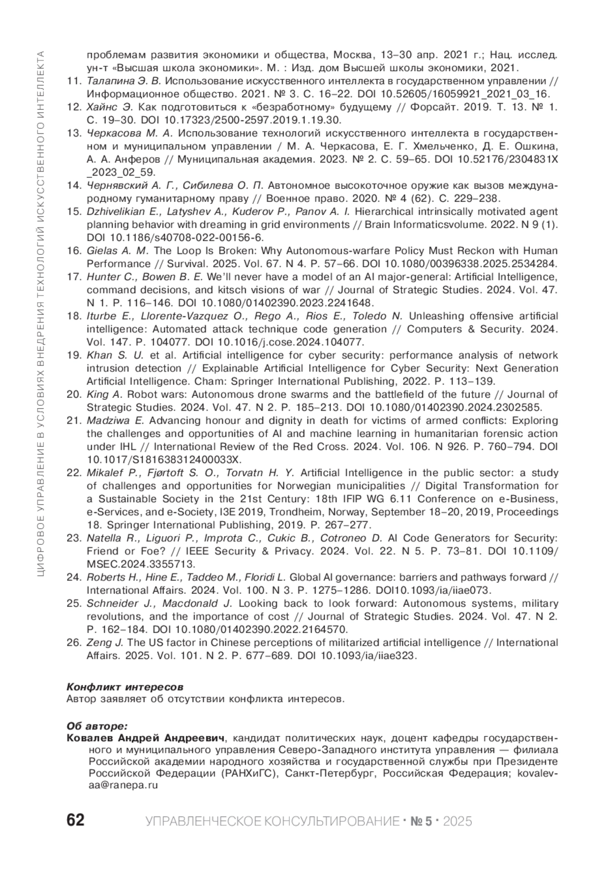 КОВАЛЕВ А. А. ВНЕДРЕНИЕ АВТОНОМНЫХ ЦИФРОВЫХ ПЛАТФОРМ В ВОЕННОЙ СФЕРЕ: СОЦИАЛЬНОЕ И ИНСТИТУЦИОНАЛЬНОЕ ИЗМЕРЕНИЯ // УПРАВЛЕНЧЕСКОЕ КОНСУЛЬТИРОВАНИЕ. 2025. № 5 (191)