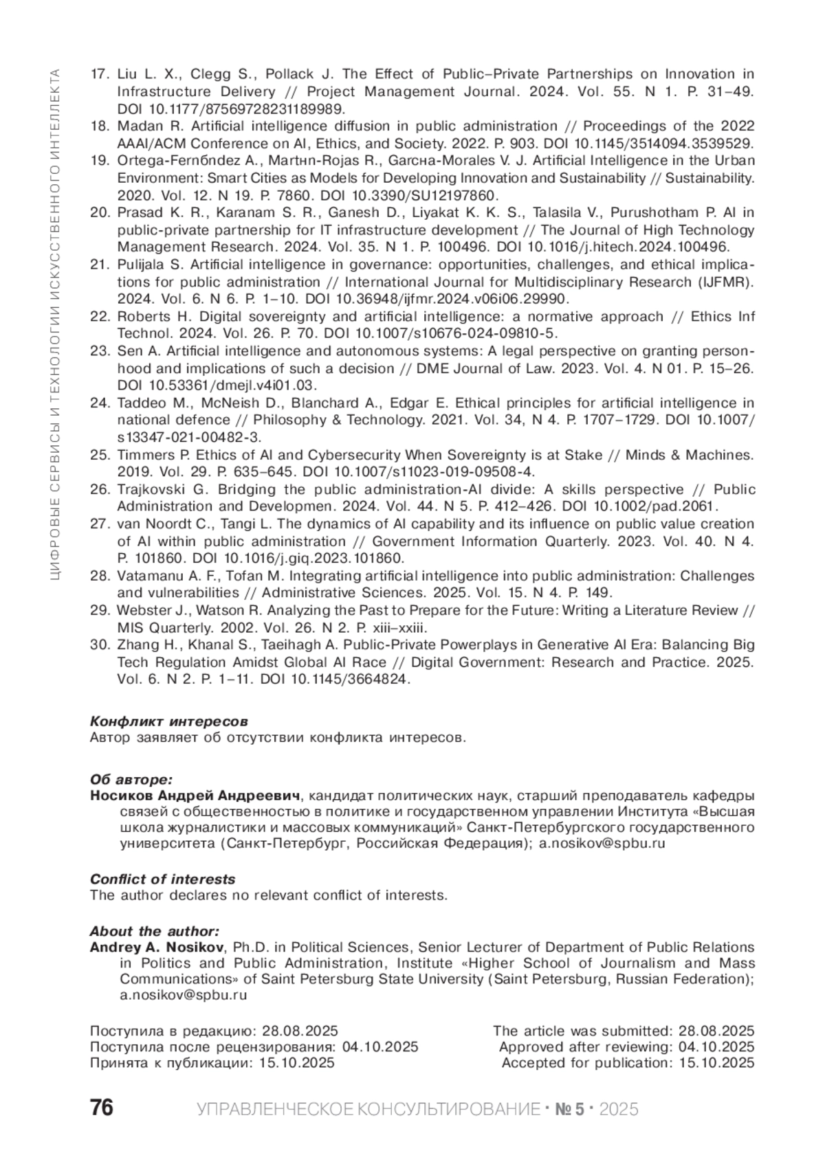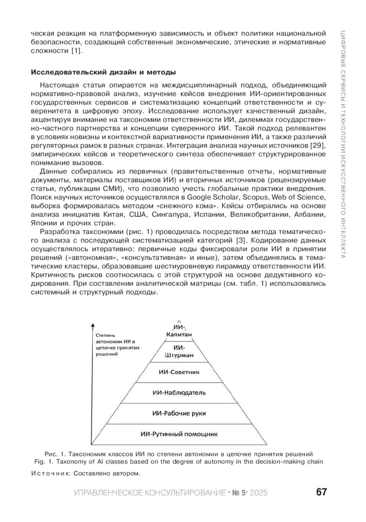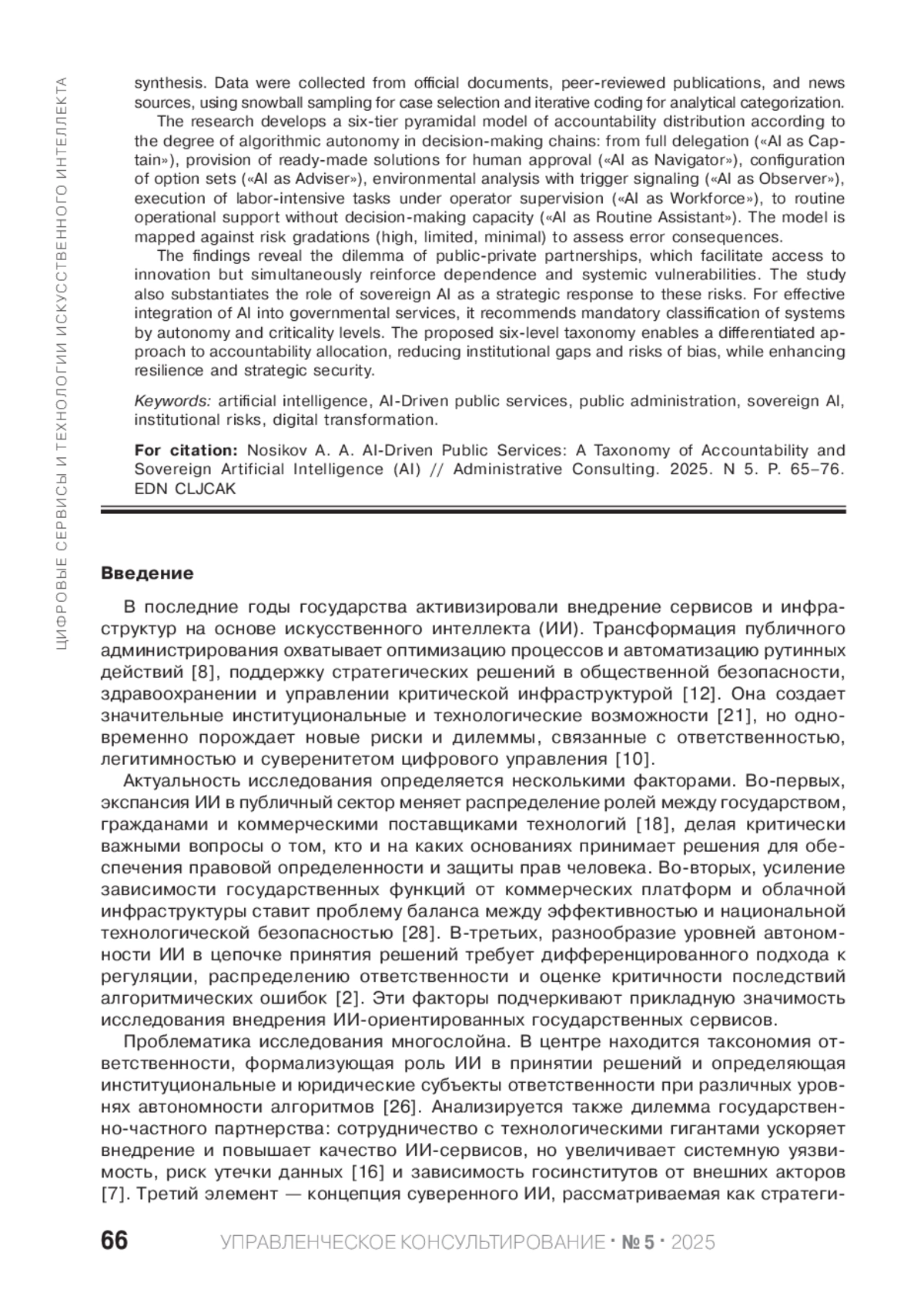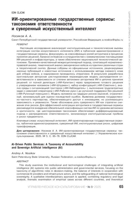 НОСИКОВ А. А. ИИ-ОРИЕНТИРОВАННЫЕ ГОСУДАРСТВЕННЫЕ СЕРВИСЫ: ТАКСОНОМИЯ ОТВЕТСТВЕННОСТИ И СУВЕРЕННЫЙ ИСКУССТВЕННЫЙ ИНТЕЛЛЕКТ // УПРАВЛЕНЧЕСКОЕ КОНСУЛЬТИРОВАНИЕ. 2025. № 5 (191)