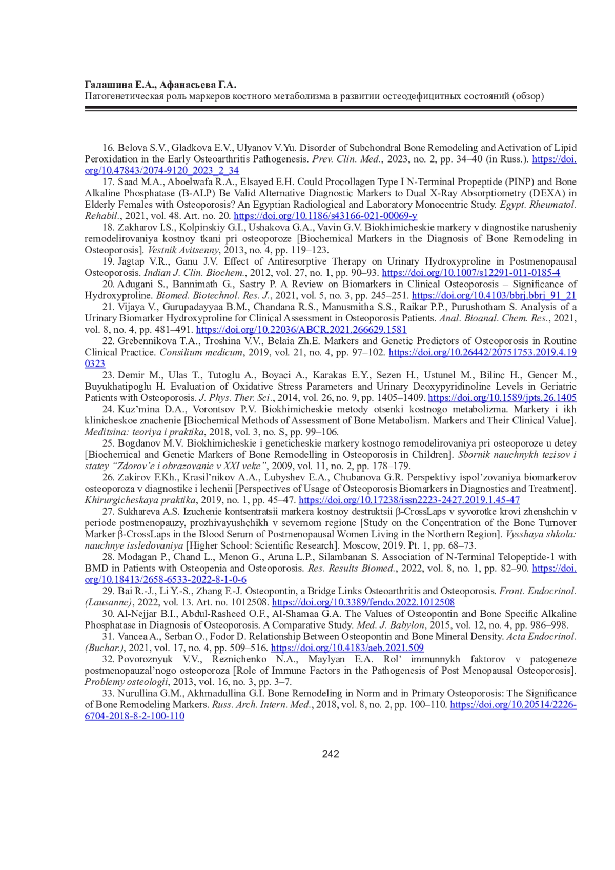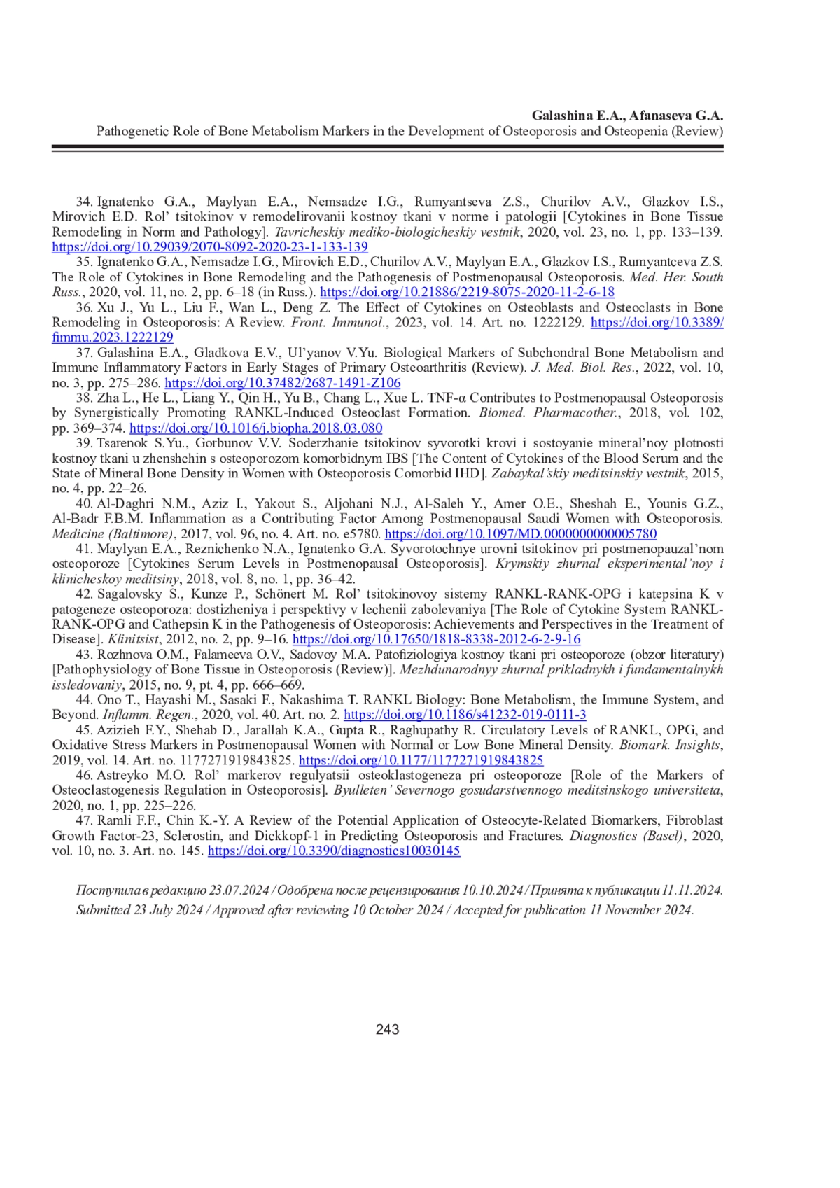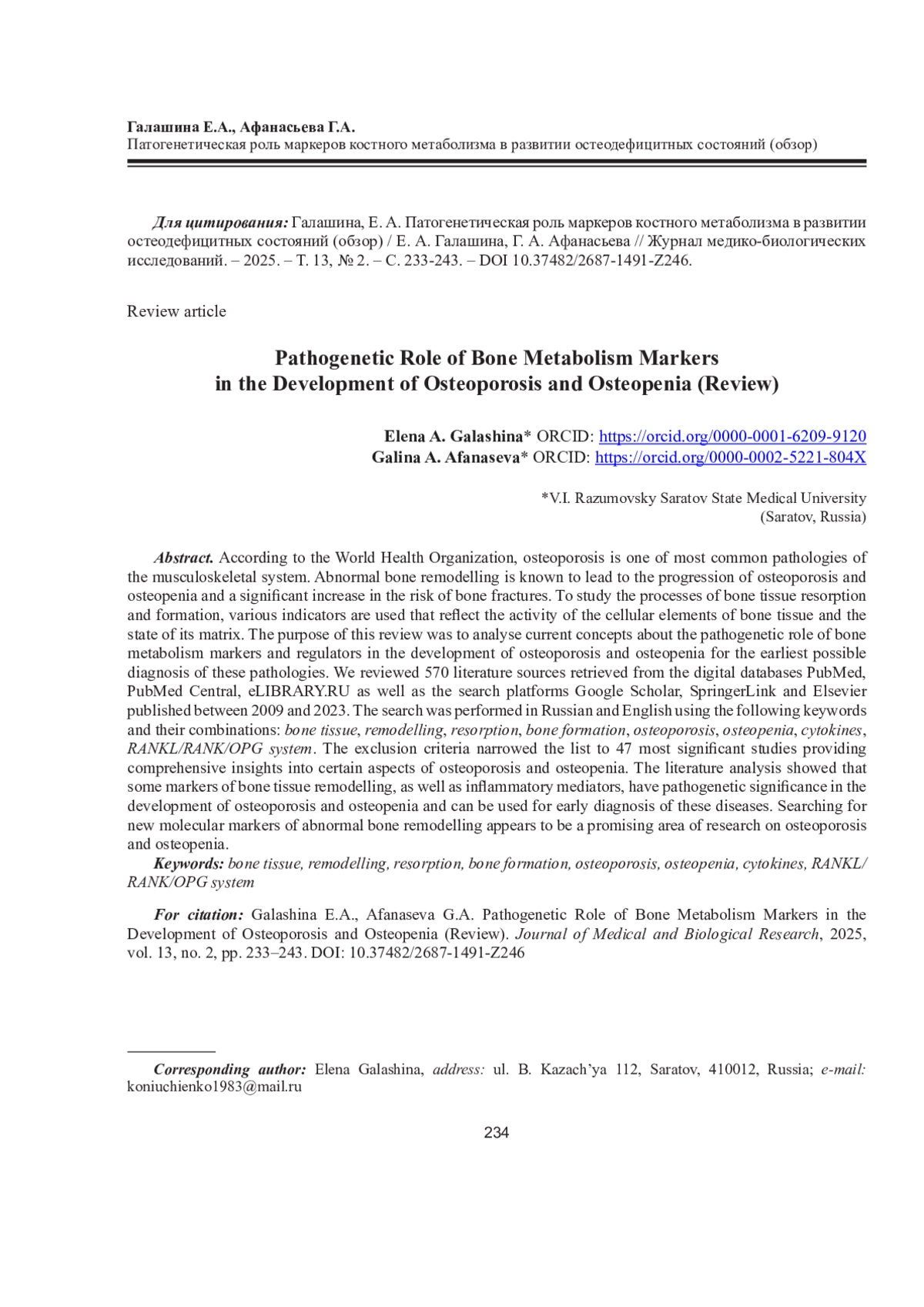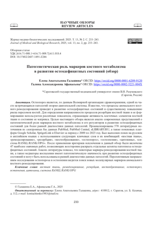 ГАЛАШИНА Е. А., АФАНАСЬЕВА Г. А. ПАТОГЕНЕТИЧЕСКАЯ РОЛЬ МАРКЕРОВ КОСТНОГО МЕТАБОЛИЗМА В РАЗВИТИИ ОСТЕОДЕФИЦИТНЫХ СОСТОЯНИЙ (ОБЗОР) // ЖУРНАЛ МЕДИКО-БИОЛОГИЧЕСКИХ ИССЛЕДОВАНИЙ. 2025. Т. 13 № 2