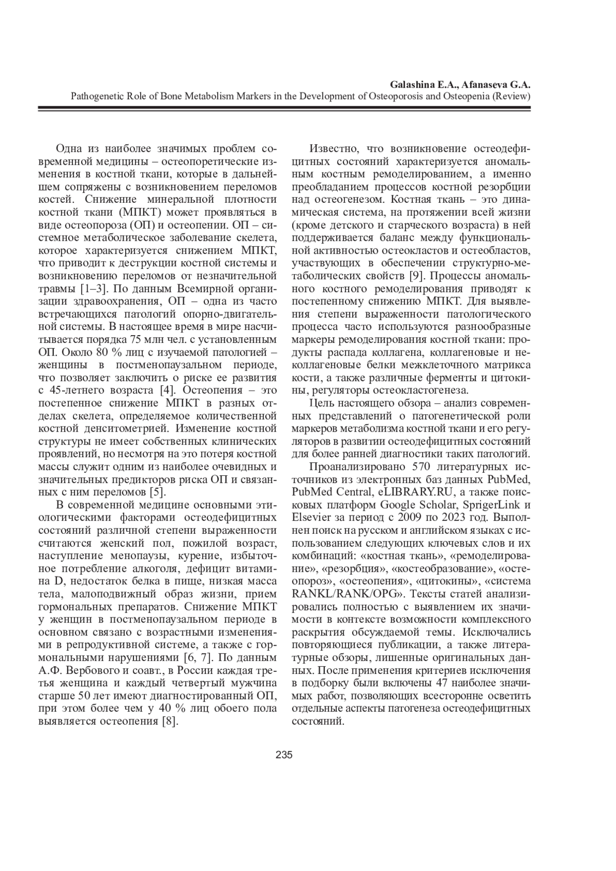 Остеопороз является, по данным Всемирной организации здравоохранения, одной из часто встречающихся патологий опорно-двигательной системы. Известно, что процессы аномального костного ремоделирования приводят к развитию остеодефицитных состояний и существенному повышению риска переломов костей. Для определения направленности процессов резорбции костной ткани и ее формирования используются различные показатели, отражающие активность клеточных элементов костной ткани и состояние ее матрикса. Целью настоящего обзора являлся анализ современных представлений о патогенетической роли маркеров костного метаболизма и его регуляторов в развитии остеодефицитных состояний для более ранней диагностики данных патологий. Проанализированы 570 литературных источников из электронных баз данных PubMed, PubMed Central, eLIBRARY. RU, а также поисковых платформ Google Scholar, SprigerLink и Elsevier за период с 2009 по 2023 год. Был выполнен поиск на русском и английском языках с использованием следующих ключевых слов и их комбинаций: «костная ткань», «ремоделирование», «резорбция», «костеобразование», «остеопороз», «остеопения», «цитокины», «система RANKL/RANK/OPG». После применения критериев исключения в данный обзор были включены 47 наиболее значимых работ, позволяющих всесторонне раскрыть отдельные аспекты патогенеза остеодефицитных состояний. Анализ литературы показал, что некоторые маркеры ремоделирования костной ткани, а также медиаторы воспаления имеют патогенетическую значимость при развитии остеодефицитных состояний и могут быть использованы в ранней диагностике данных патологий. Перспективным направлением исследования остеопороза и остеопении видится поиск новых молекулярных маркеров аномального костного ремоделирования.