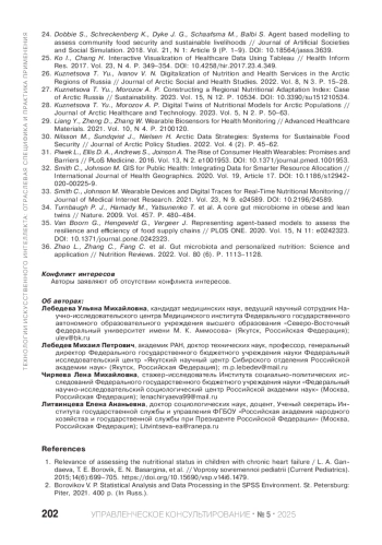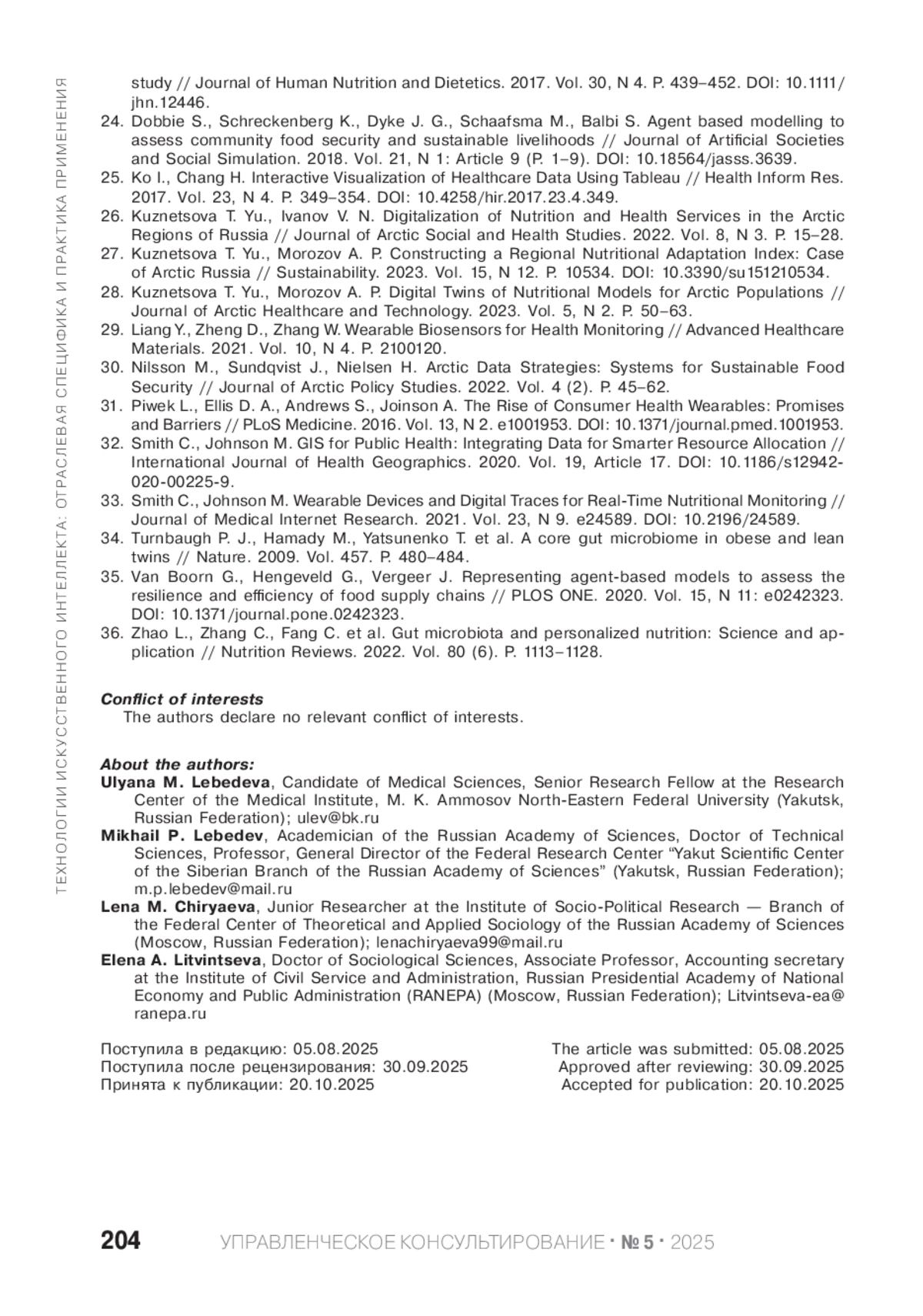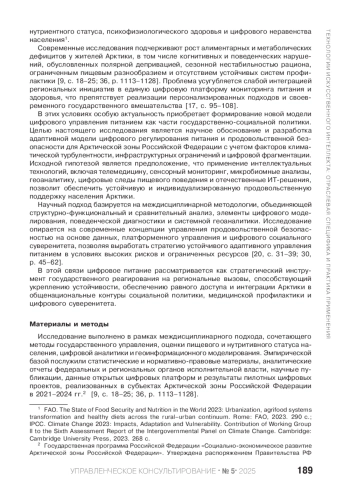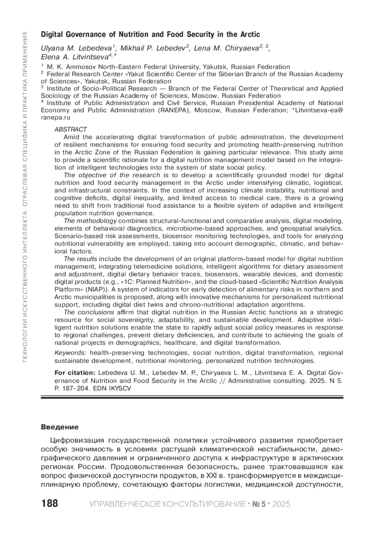 ЛЕБЕДЕВА У. М., ЛЕБЕДЕВ М. П., ЧИРЯЕВА Л. М., ЛИТВИНЦЕВА Е. А. ЦИФРОВОЕ УПРАВЛЕНИЕ ПИТАНИЕМ И ПРОДОВОЛЬСТВЕННОЙ БЕЗОПАСНОСТЬЮ В АРКТИКЕ // УПРАВЛЕНЧЕСКОЕ КОНСУЛЬТИРОВАНИЕ. 2025. № 5 (191)