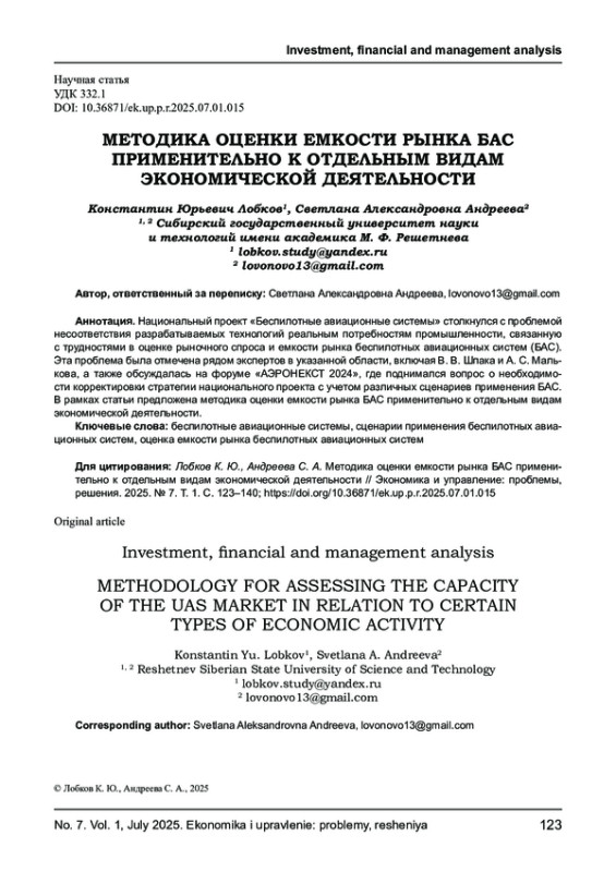 Национальный проект «Беспилотные авиационные системы» столкнулся с проблемой несоответствия разрабатываемых технологий реальным потребностям промышленности, связанную с трудностями в оценке рыночного спроса и емкости рынка беспилотных авиационных систем (БАС). Эта проблема была отмечена рядом экспертов в указанной области, включая В. В. Шпака и А. С. Малькова, а также обсуждалась на форуме «АЭРОНЕКСТ 2024», где поднимался вопрос о необходимости корректировки стратегии национального проекта с учетом различных сценариев применения БАС. В рамках статьи предложена методика оценки емкости рынка БАС применительно к отдельным видам экономической деятельности.