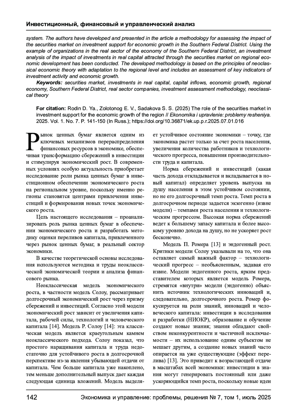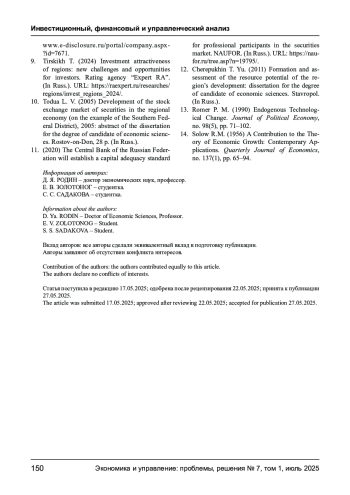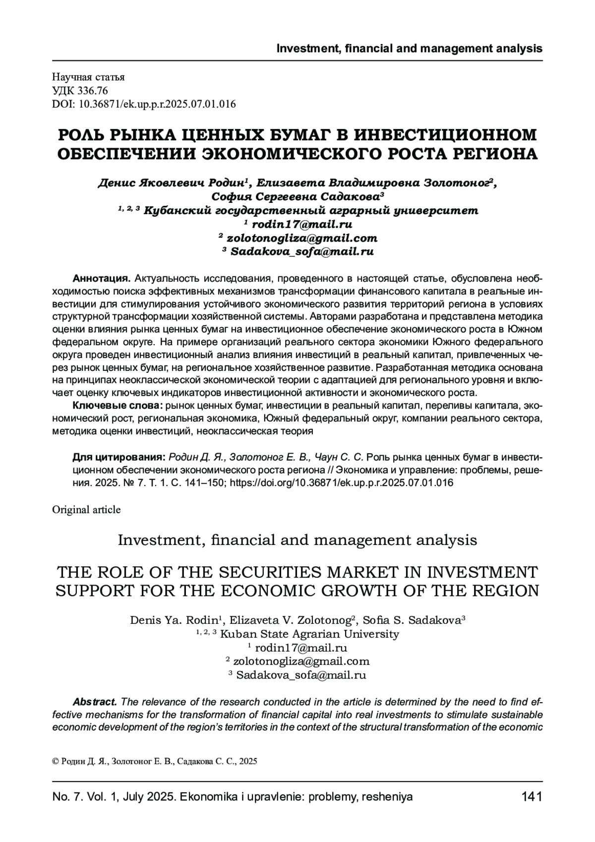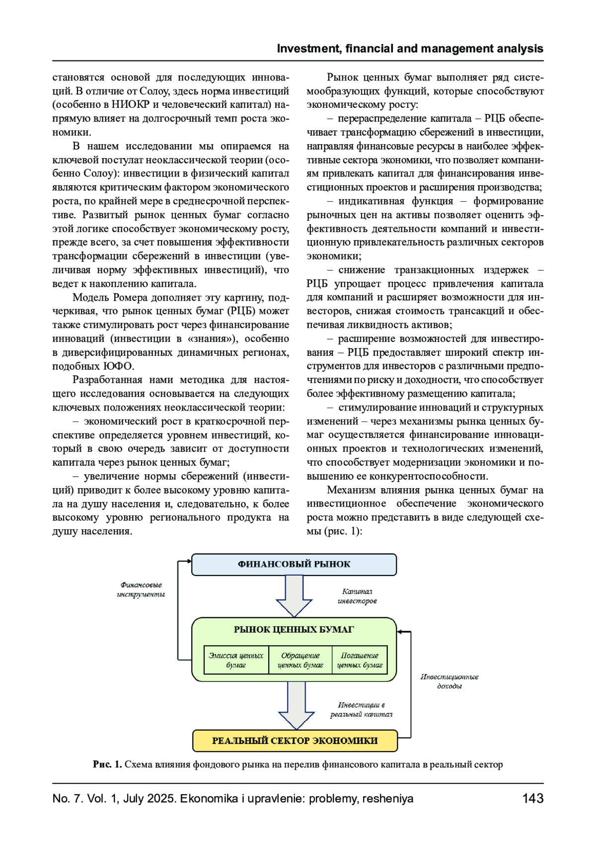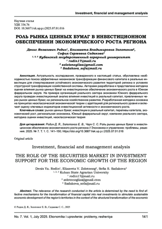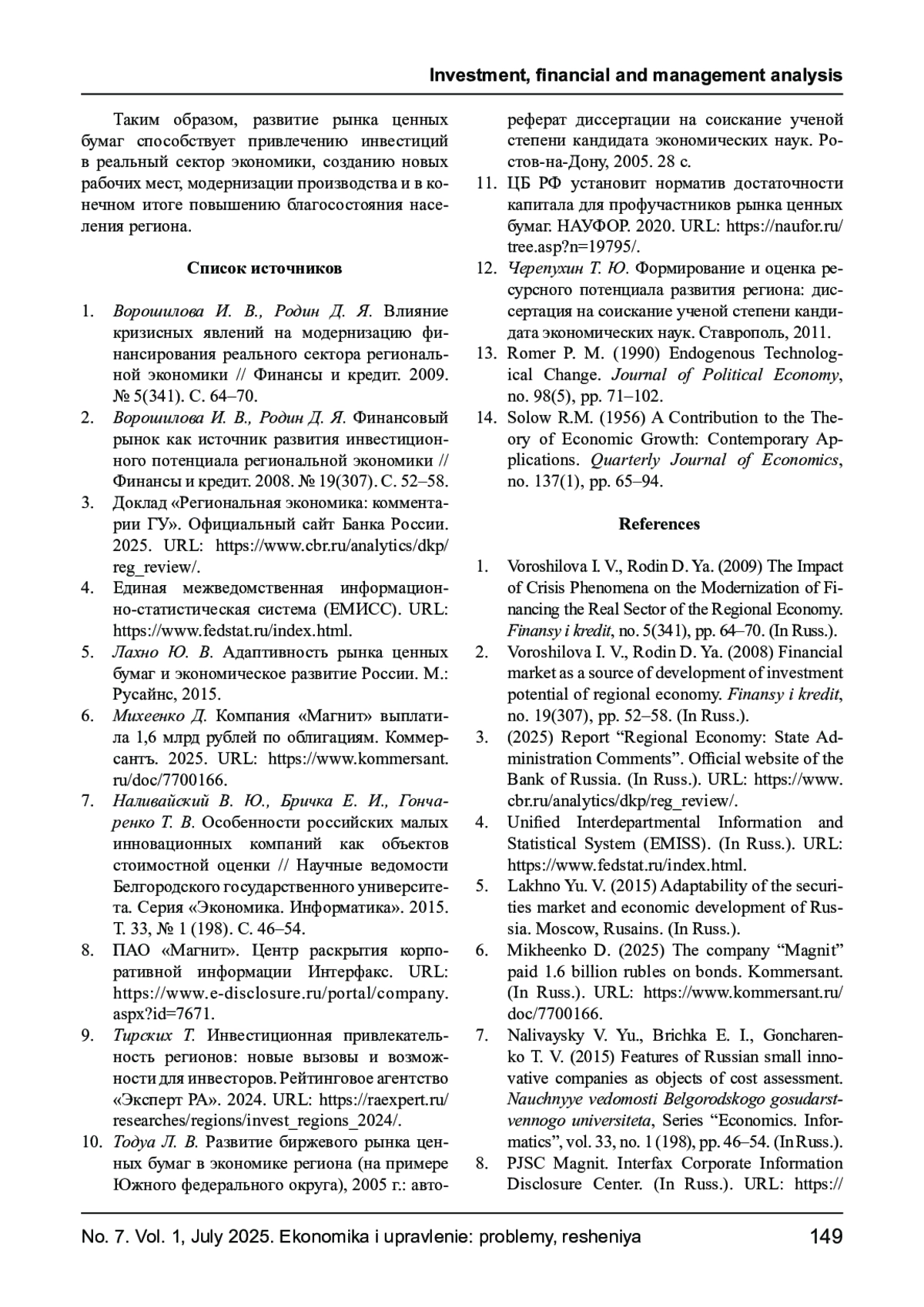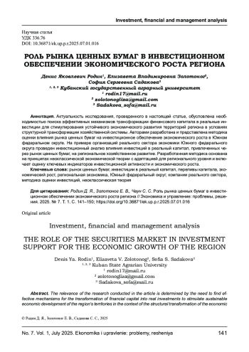 РОДИН Д. Я., ЗОЛОТОНОГ Е. В., САДАКОВА С. С. РОЛЬ РЫНКА ЦЕННЫХ БУМАГ В ИНВЕСТИЦИОННОМ ОБЕСПЕЧЕНИИ ЭКОНОМИЧЕСКОГО РОСТА РЕГИОНА // ЭКОНОМИКА И УПРАВЛЕНИЕ: ПРОБЛЕМЫ, РЕШЕНИЯ. 2025. ТОМ 1 № 7