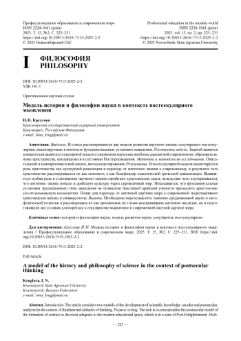 Введение. В статье рассматриваются две модели развития научного знания: секулярная и постсекулярная, анализируемые в контексте фундаментальных установок мышления.
