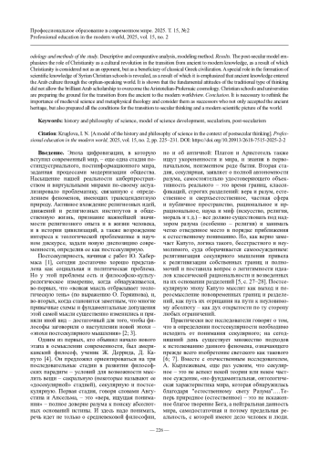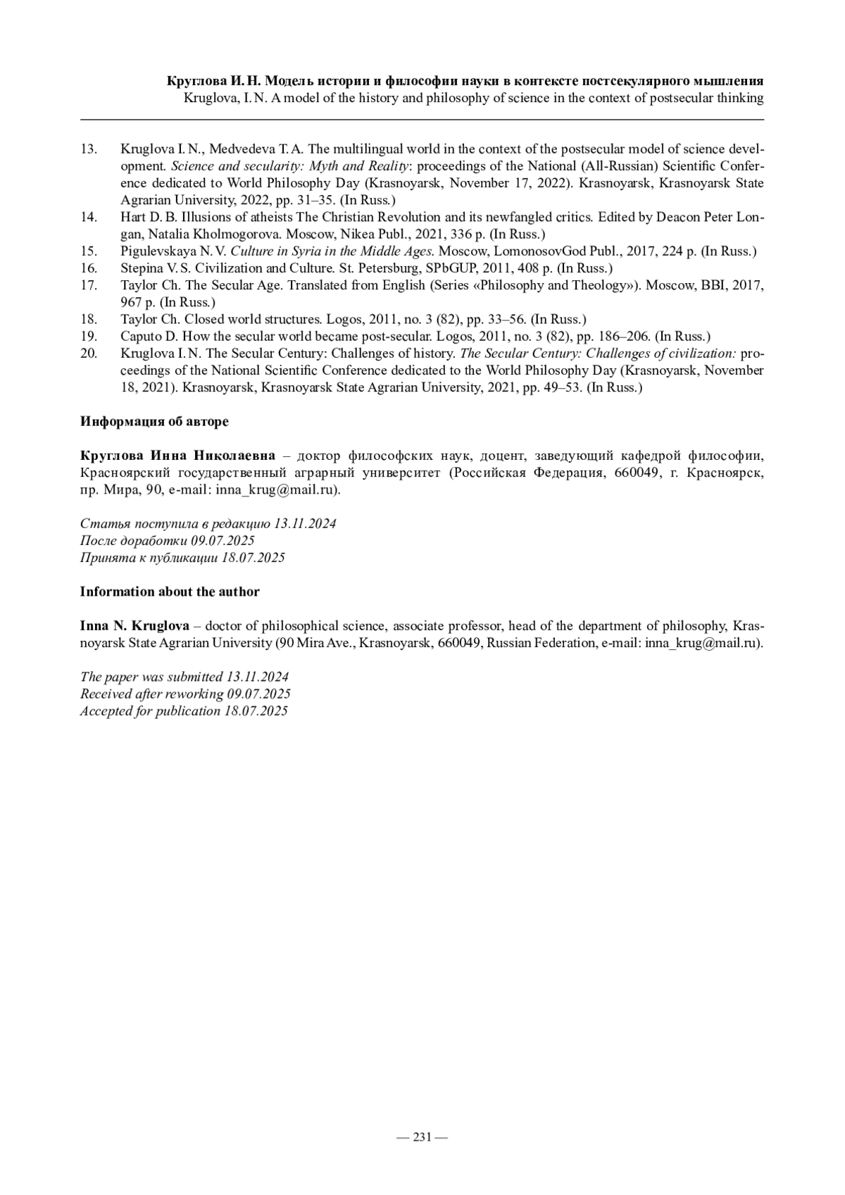 10. Круглова И.Н. Постсекулярная модель истории и философии науки // Наука и секулярность: миф и реальность: материалы Национальной (Всероссийской) научной конференции, посвященной Всемирному дню философии (Красноярск, 17 ноября 2022 г.). Красноярск: Красноярский ГАУ, 2022. С. 27-31.