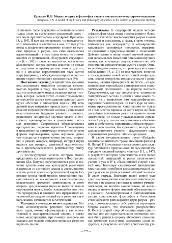 Постановка задачи. Задачей является концептуализация постсекулярной модели становления науки как наиболее адекватной современному образовательному пространству, находящемуся в состоянии Постпросвещения.