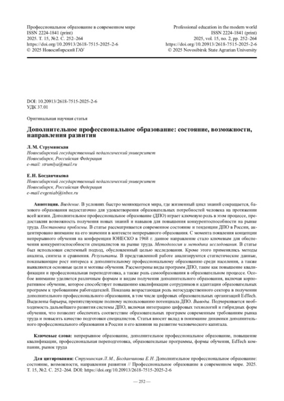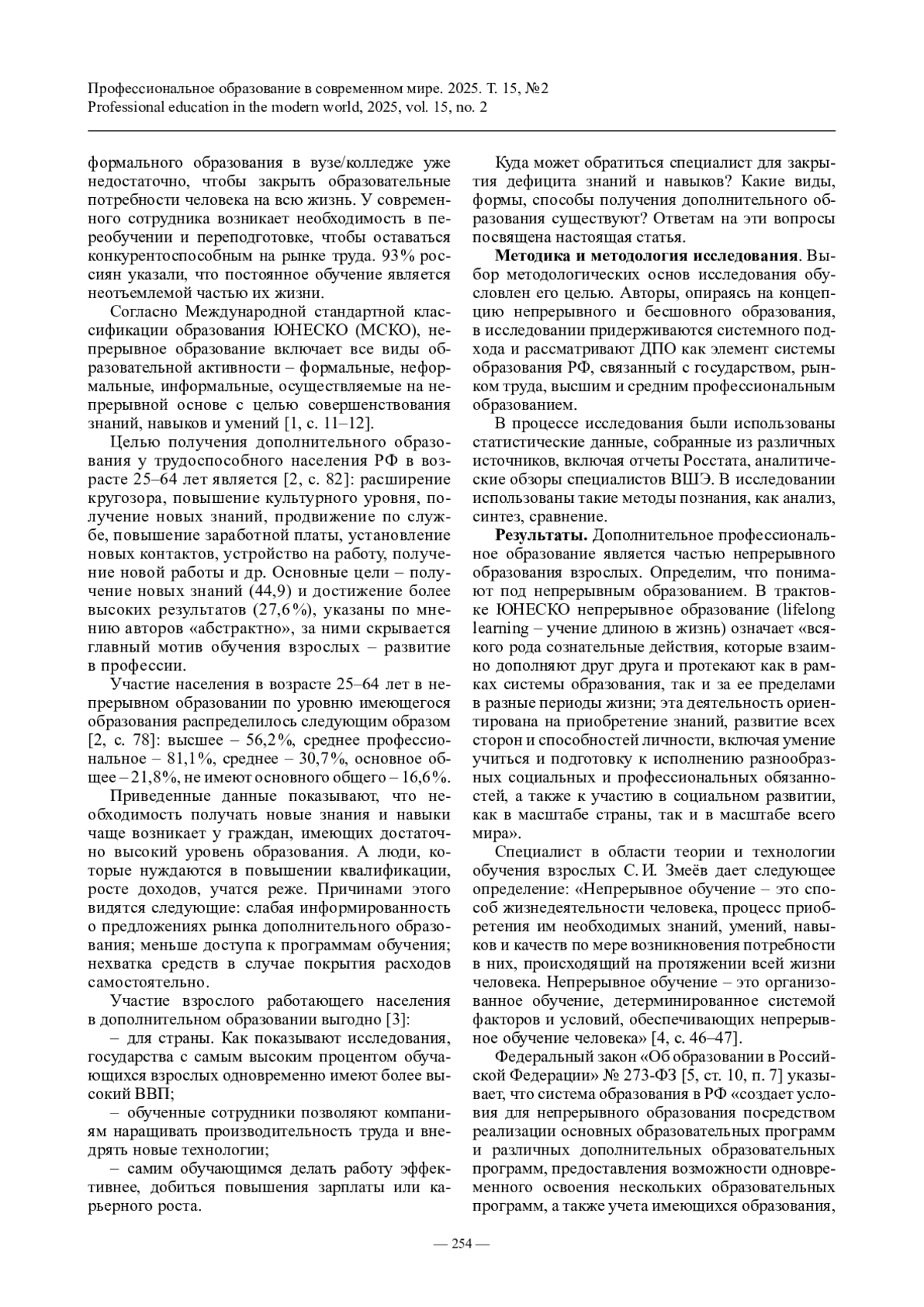 Выводы. Подчеркивается необходимость дальнейшего развития системы ДПО, включая интеграцию цифровых технологий и гибридных форм обучения, что позволит обеспечить соответствие образовательных программ современным требованиям рынка труда и повысить качество подготовки специалистов. Статья вносит вклад в понимание динамики дополнительного профессионального образования в России и его влияния на развитие человеческого капитала.