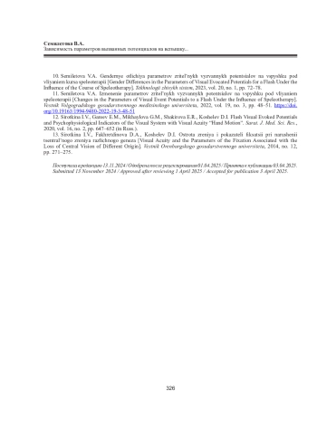 10. Семилетова В.А. Гендерные отличия параметров зрительных вызванных потенциалов на вспышку под влиянием курса спелеотерапии // Технологии живых систем. 2023. Т. 20, No 1. С. 72-78. EDN: MGZLXD
