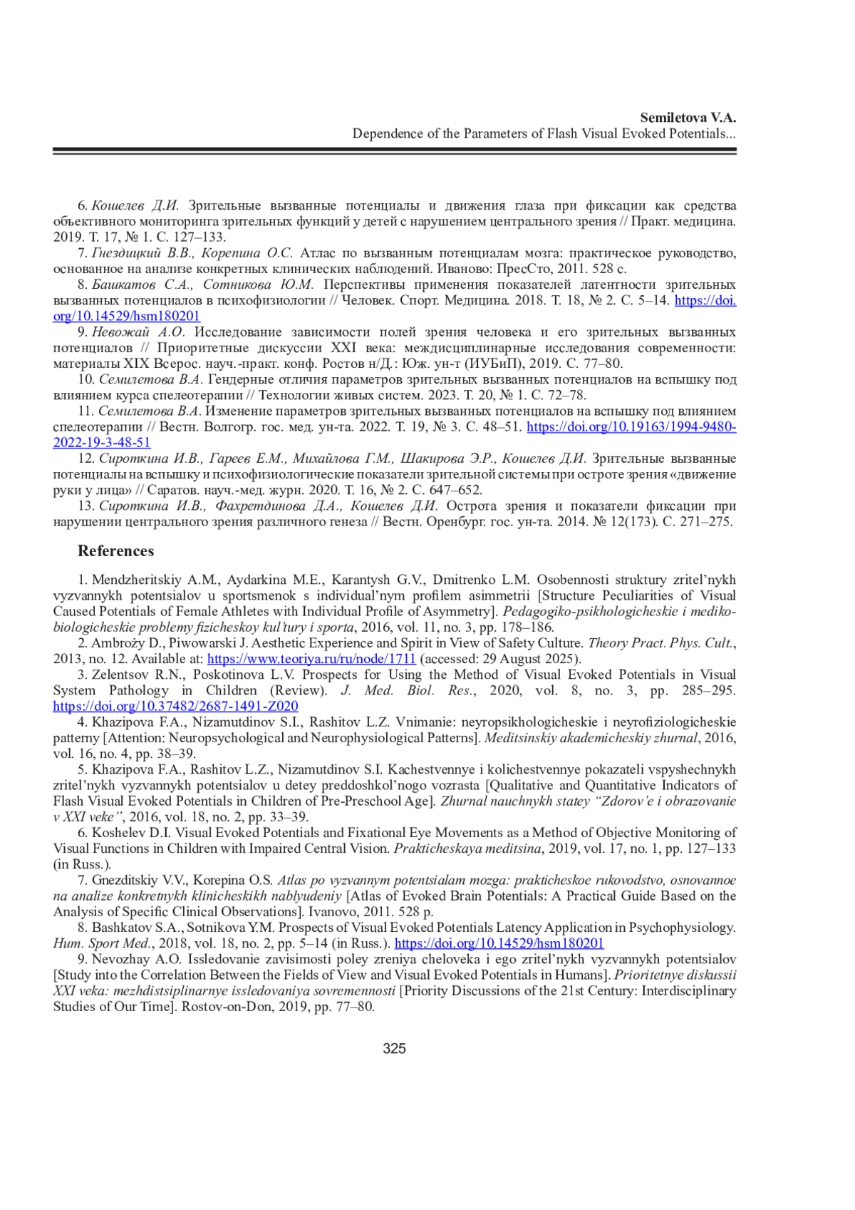 8. Башкатов С.А., Сотникова Ю.М. Перспективы применения показателей латентности зрительных вызванных потенциалов в психофизиологии // Человек. Спорт. Медицина. 2018. Т. 18, No 2. С. 5-14. DOI: 10.14529/hsm180201 EDN: XRAIBF