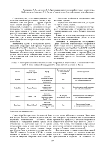Методика и методология исследования. Использованы методы: монографический, системного анализа, статистические, включая, опросы, сводку, группировку, расчет относительных величин. Авторы проанализировали особенности использования рассматриваемых сервисов: тариф, целевая аудитория, доступность на территории РФ. Проведено два статистических исследования в форме опросов особенностей использования преподавателями и студентами четырех российских вузов генеративных нейросетевых ассистентов.