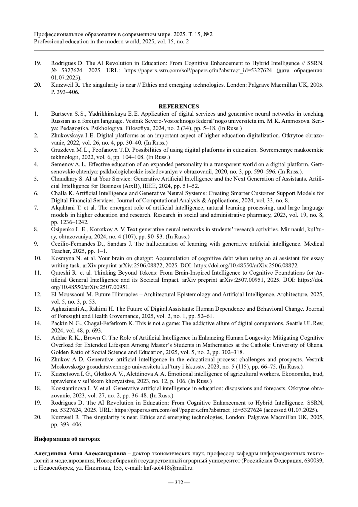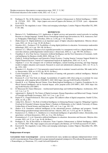 19. Rodrigues D. The AI Revolution in Education: From Cognitive Enhancement to Hybrid Intelligence // SSRN. № 5327624. 2025. URL: https://papers.ssrn.com/sol3/papers.cfm?abstract_id=5327624 (дата обращения: 01.07.2025).