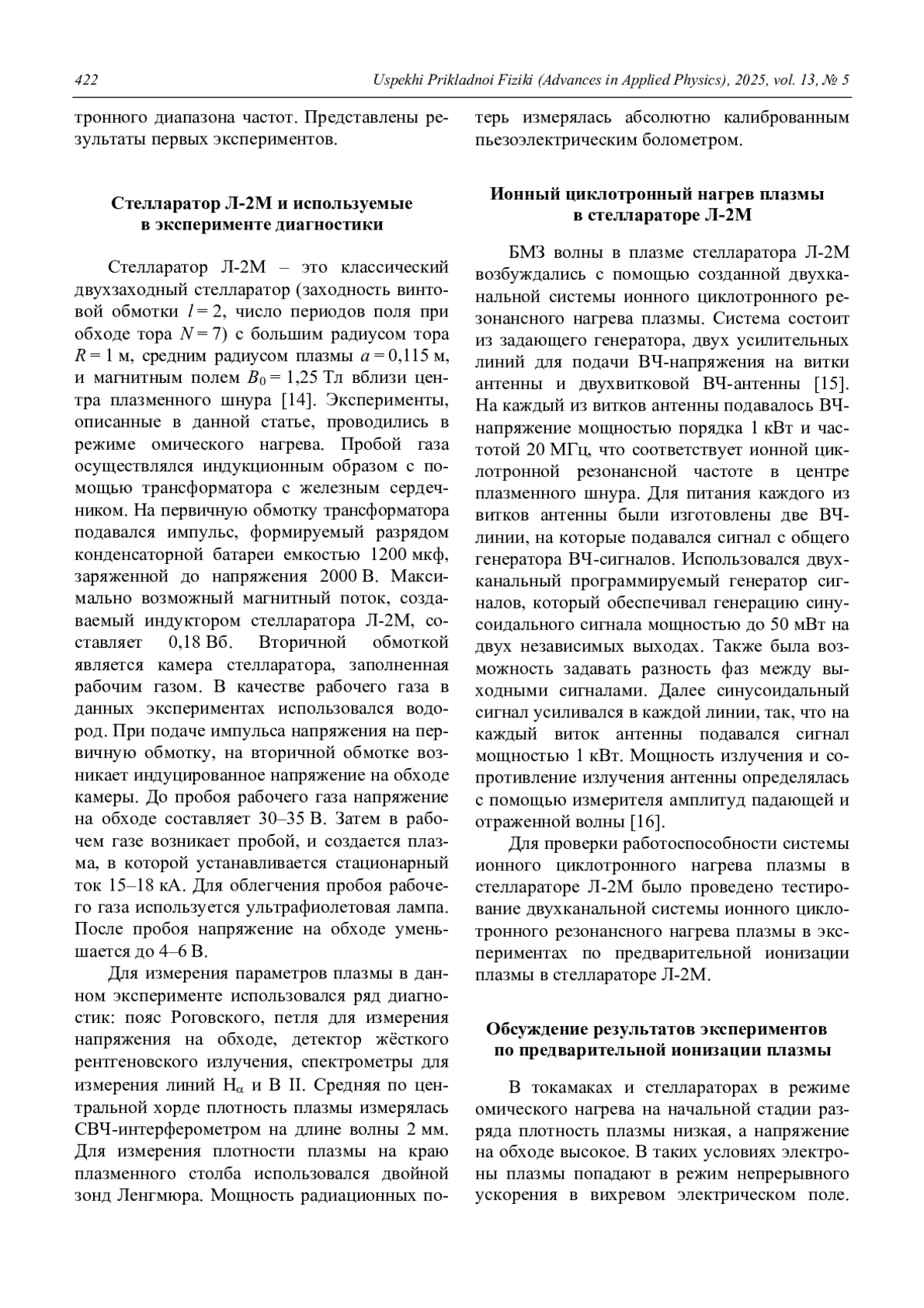 Проведены эксперименты по предварительной ионизации плазмы стелларатора Л-2М с использованием двухканальной системы ионного циклотронного резонансно-го нагрева. Мощность каждого канала нагрева составляла 1 кВт. ВЧ-мощность для предварительной ионизации рабочего газа подавалась на антенну за 10 мс до возникновения напряжения на обходе. Проведение предварительной ионизации позволило уменьшить напряжение на обходе перед пробоем рабочего газа на 15–20 %. Задержка между моментом возникновения напряжения на обходе и моментом пробоя рабочего газа уменьшилась вдвое. Вследствие этого наблюдалось подавление генерации убегающих электронов на начальной стадии разряда, возникающей в условиях низкой плотности плазмы и высокого напряжения на обходе. При подаче ВЧ-напряжения на антенну детектором ДРГ3-01 было зарегистрировано уменьшение интенсивности жесткого рентгеновского излучения в 10 раз, что указывает на подавление генерации убегающих электронов. Наилучшее подавление генерации убегающих электронов наблюдалось в условиях, когда ВЧ-импульс предварительной ионизации подавался за 10 мс до возникновения напряжения на обходе и заканчивался через 10 мс после пробоя рабочего газа.