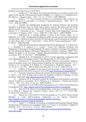 8. Public-Private Partnership in Municipal Solid Waste Management / S. S. Morkovina, L. V. Bryndina, V. E. Sukhova, A. V. Ivanova // Vision 2025: Education Excellence and Management of Innovations through Sustainable Economic Competitive Advantage: Proceedings of the 34rd International Business Information Management Association Conference, IBIMA 2019, Madrid, 13-14 ноября 2019 года. - Madrid: International Business Information Management Association, 2019. - P. 2811-2821. EDN: RQHPKQ