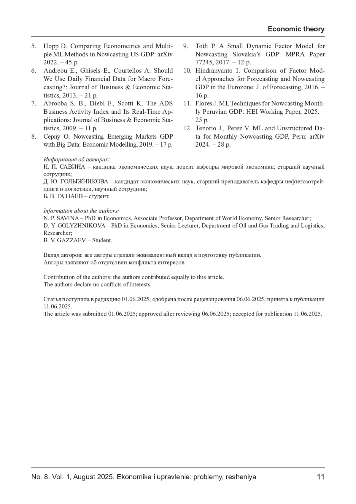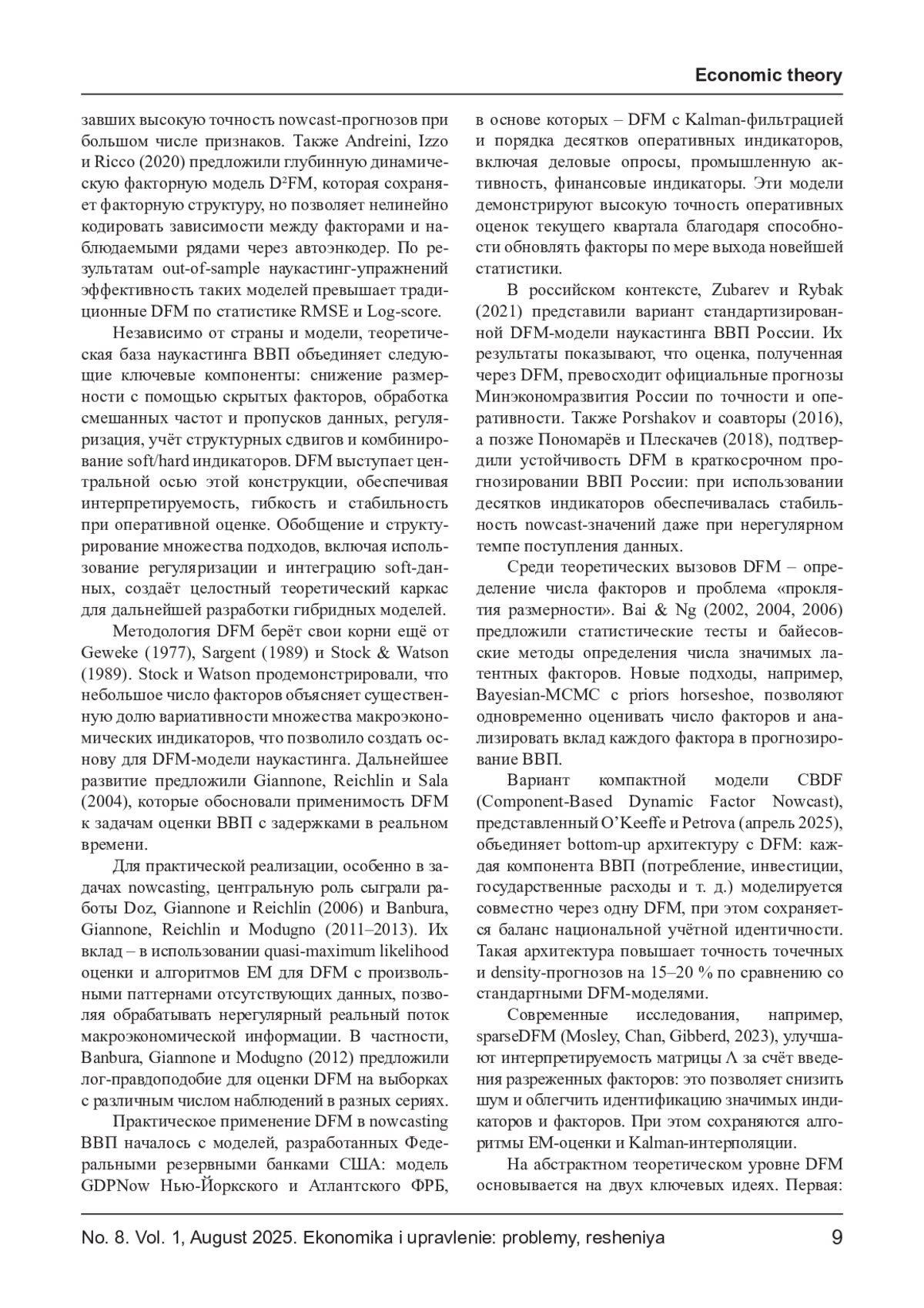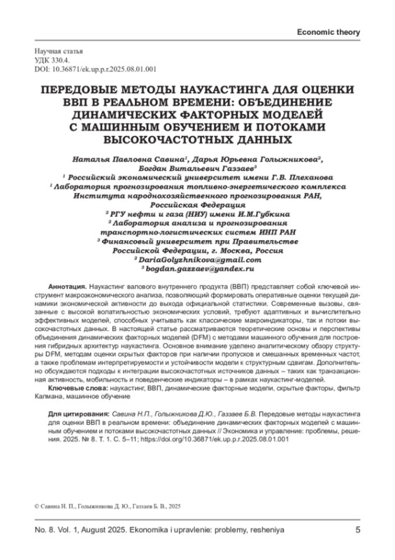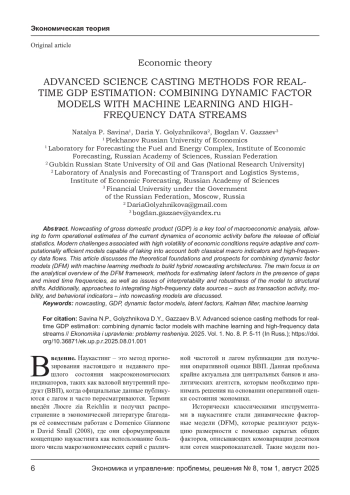 Наукастинг валового внутреннего продукта (ВВП) представляет собой ключевой инструмент макроэкономического анализа, позволяющий формировать оперативные оценки текущей динамики экономической активности до выхода официальной статистики. Современные вызовы, связанные с высокой волатильностью экономических условий, требуют адаптивных и вычислительно эффективных моделей, способных учитывать как классические макроиндикаторы, так и потоки высокочастотных данных. В настоящей статье рассматриваются теоретические основы и перспективы объединения динамических факторных моделей (DFM) с методами машинного обучения для построения гибридных архитектур наукастинга. Основное внимание уделено аналитическому обзору структуры DFM, методам оценки скрытых факторов при наличии пропусков и смешанных временных частот, а также проблемам интерпретируемости и устойчивости модели к структурным сдвигам. Дополнительно обсуждаются подходы к интеграции высокочастотных источников данных - таких как транзакционная активность, мобильность и поведенческие индикаторы - в рамках наукастинг-моделей.