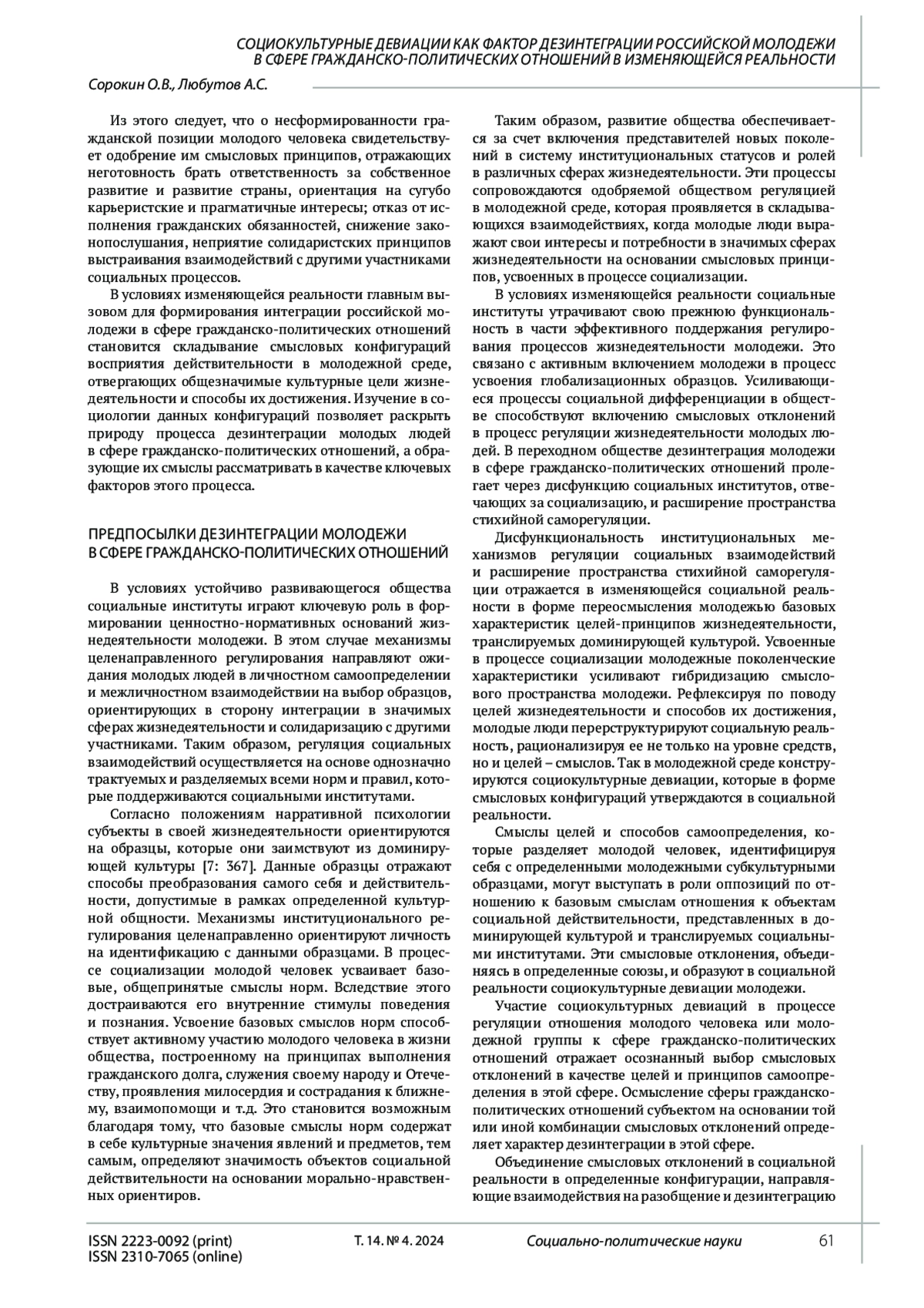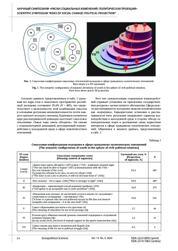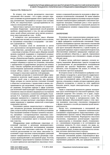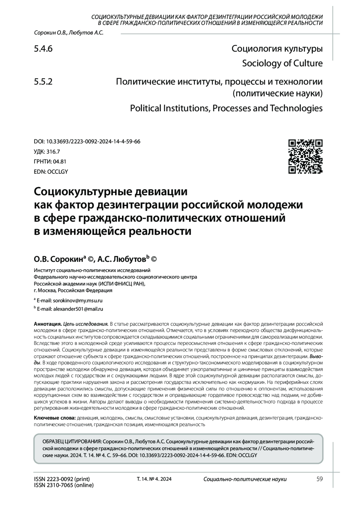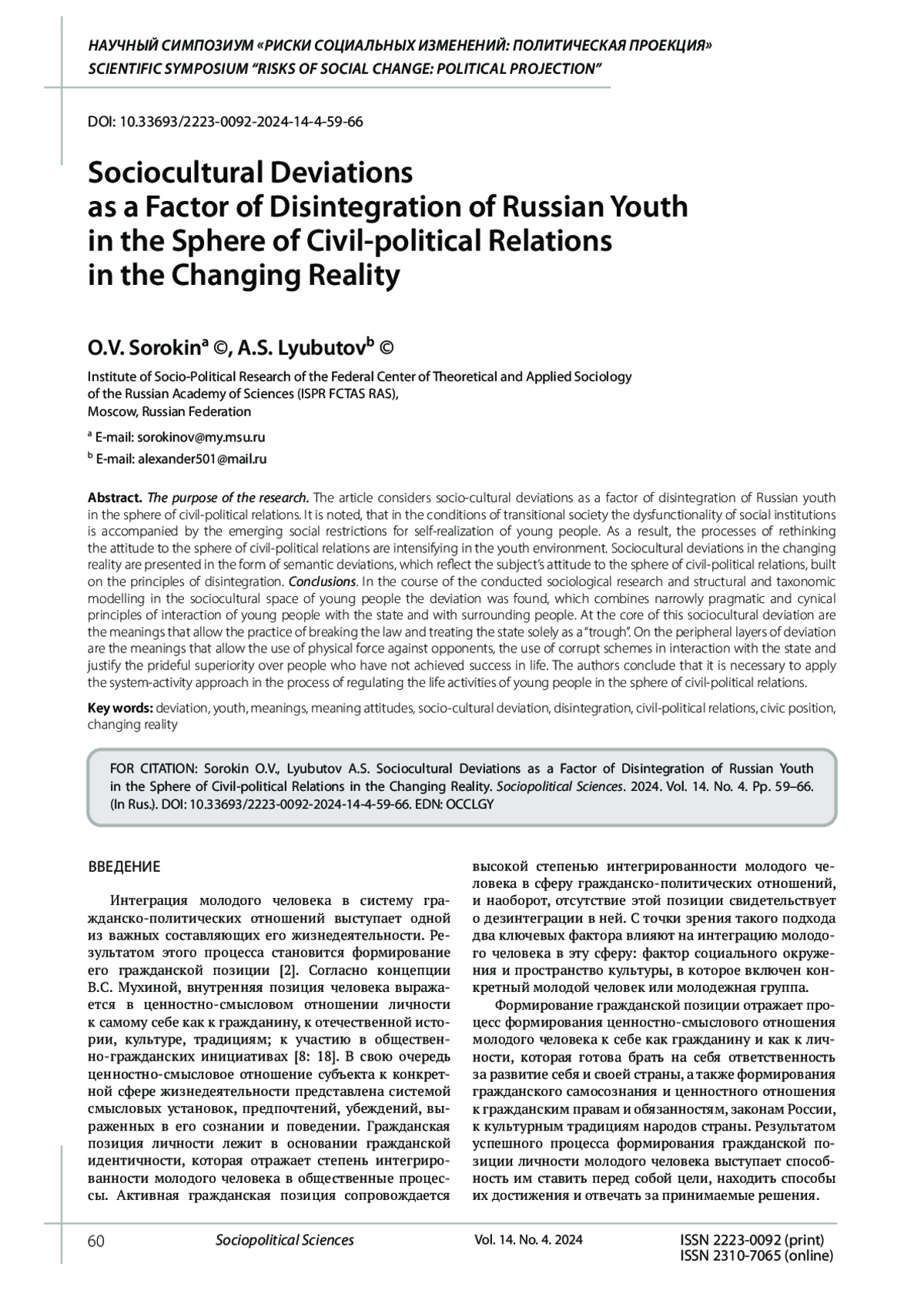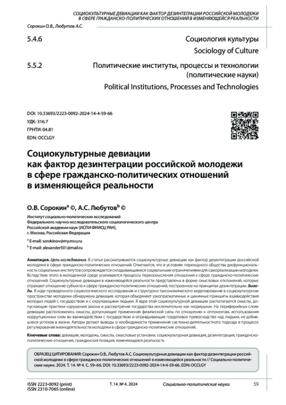 Цель исследования. В статье рассматриваются социокультурные девиации как фактор дезинтеграции российской молодежи в сфере гражданско-политических отношений. Отмечается, что в условиях переходного общества дисфункциональность социальных институтов сопровождается складывающимися социальными ограничениями для самореализации молодежи. Вследствие этого в молодежной среде усиливаются процессы переосмысления отношения к сфере гражданско-политических отношений. Социокультурные девиации в изменяющейся реальности представлены в форме смысловых отклонений, которые отражают отношение субъекта к сфере гражданско-политических отношений, построенное на принципах дезинтеграции. Выводы. В ходе проведенного социологического исследования и структурно-таксономического моделирования в социокультурном пространстве молодежи обнаружена девиация, которая объединяет узкопрагматичные и циничные принципы взаимодействия молодых людей с государством и с окружающими людьми. В ядре этой социокультурной девиации располагаются смыслы, допускающие практики нарушения закона и рассмотрения государства исключительно как «кормушки». На периферийных слоях девиации расположились смыслы, допускающие применения физической силы по отношению к оппонентам, использования коррупционных схем во взаимодействии с государством и оправдывающие горделивое превосходство над людьми, не добившихся успехов в жизни. Авторы делают выводы о необходимости применения системно-деятельностного подхода в процессе регулирования жизнедеятельности молодежи в сфере гражданско-политических отношений.