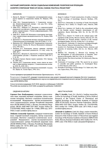 Zubok Yu.A., Lyubutov A.S. Youth in the sociocultural reality of the Russian society: Semantic determinants of self-regulation. Russia Reforming. 2022. No. 20. Pp. 339-378. (In Rus.). EDN: JEIBXB