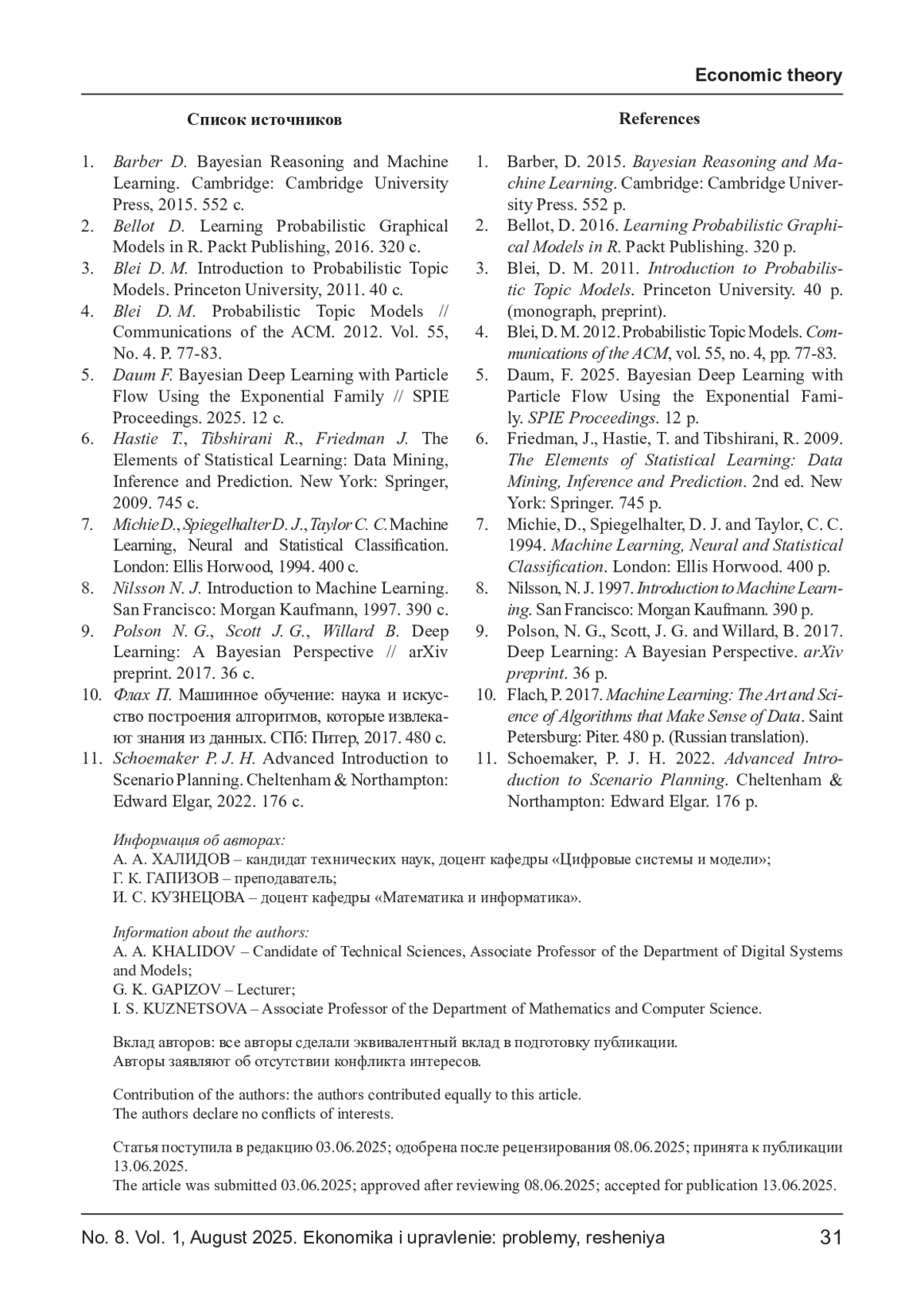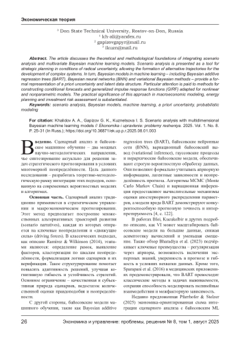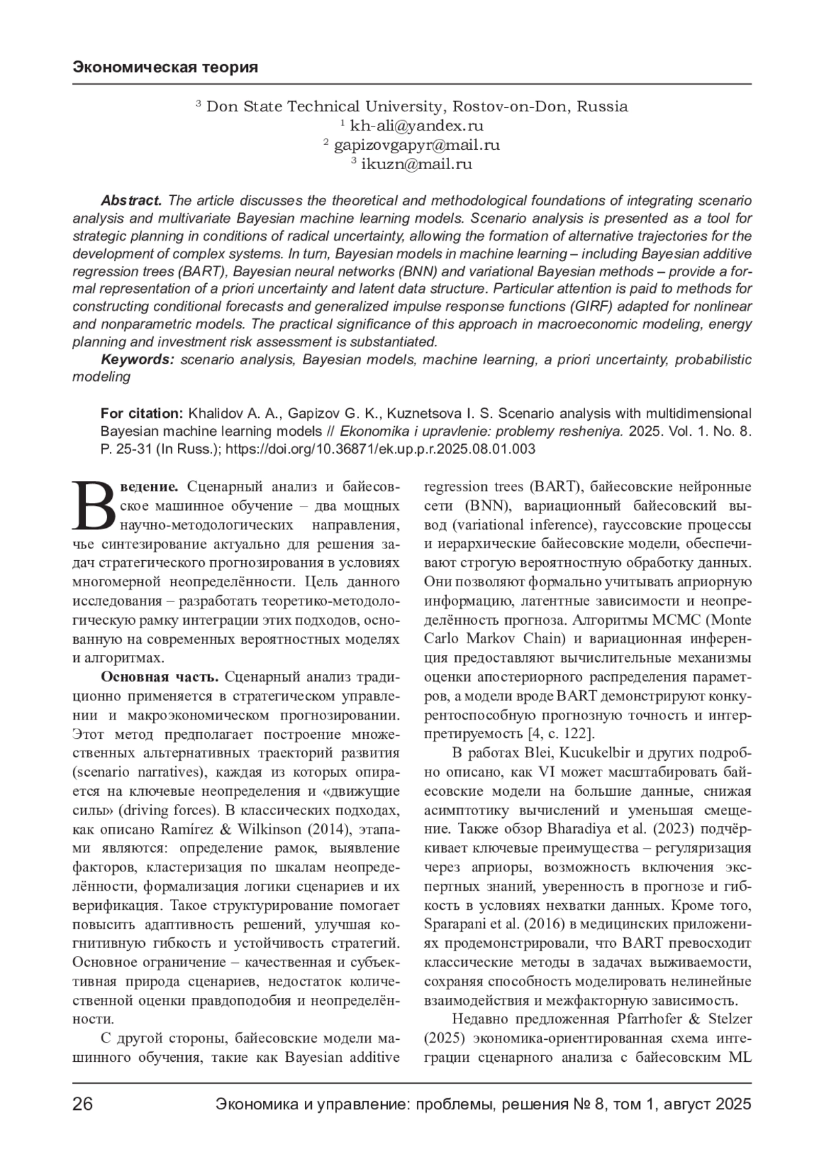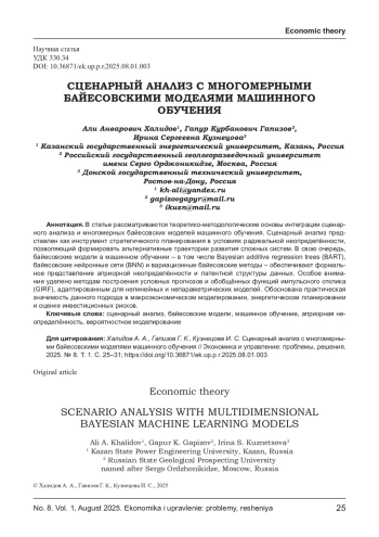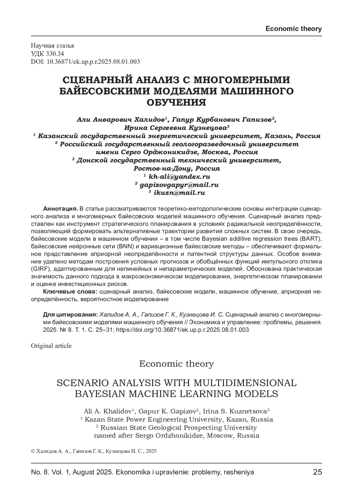 ХАЛИДОВ А. А., ГАПИЗОВ Г. К., КУЗНЕЦОВА И. С. СЦЕНАРНЫЙ АНАЛИЗ С МНОГОМЕРНЫМИ БАЙЕСОВСКИМИ МОДЕЛЯМИ МАШИННОГО ОБУЧЕНИЯ // ЭКОНОМИКА И УПРАВЛЕНИЕ: ПРОБЛЕМЫ, РЕШЕНИЯ. 2025. ТОМ 1 № 8