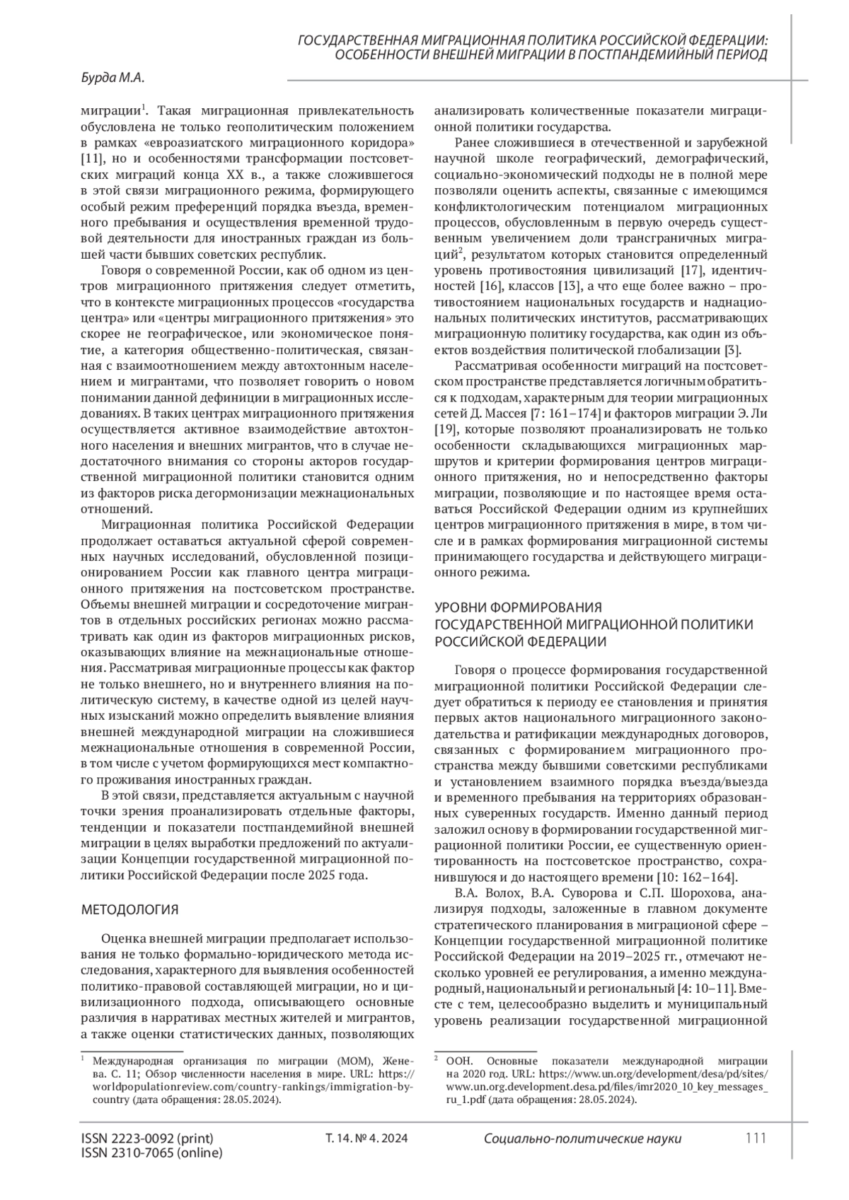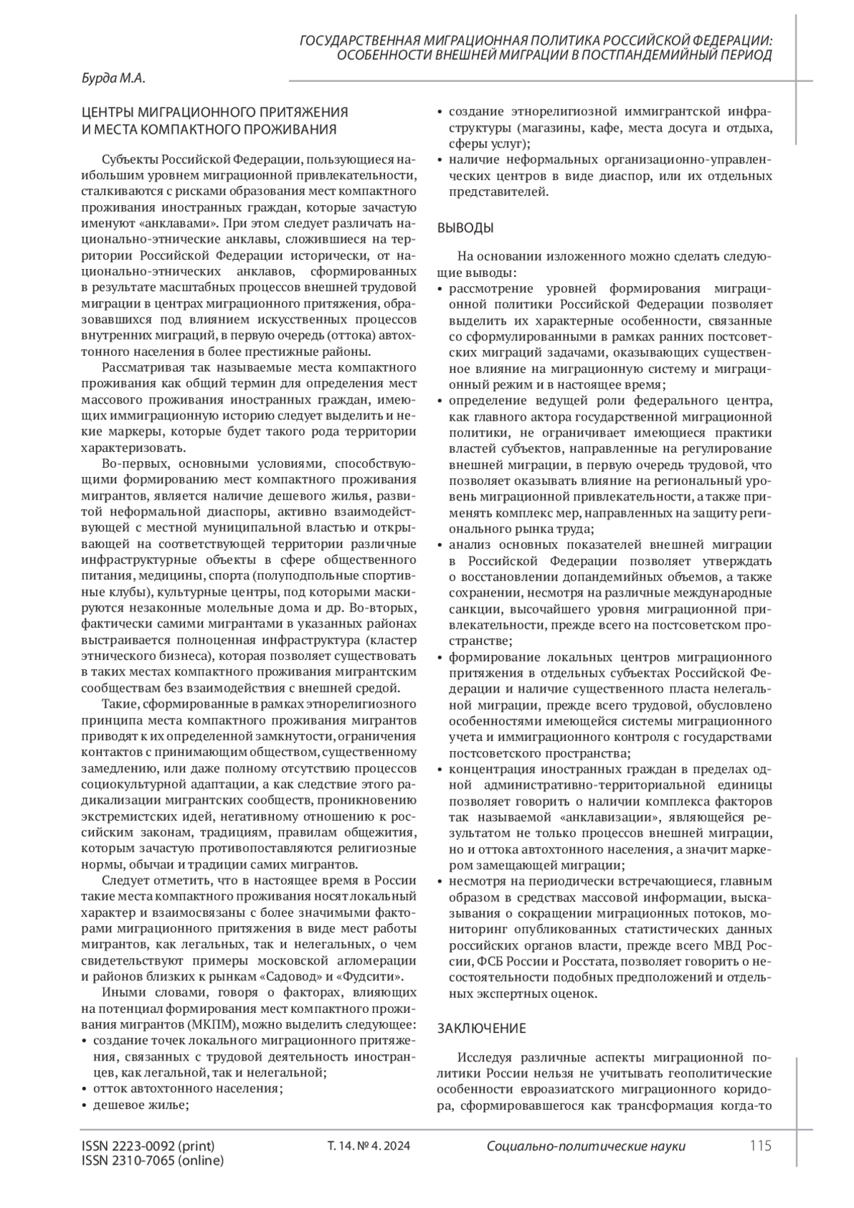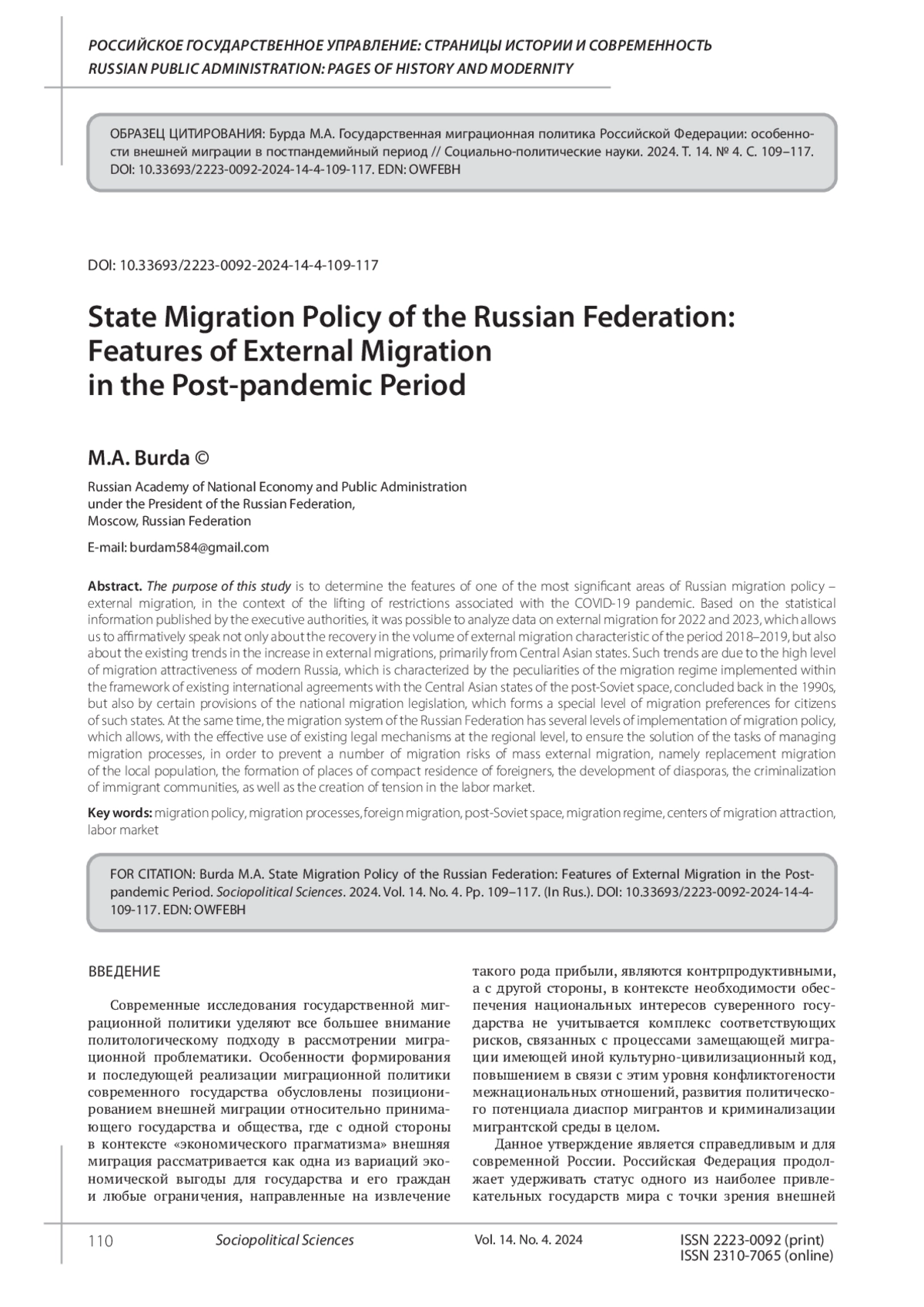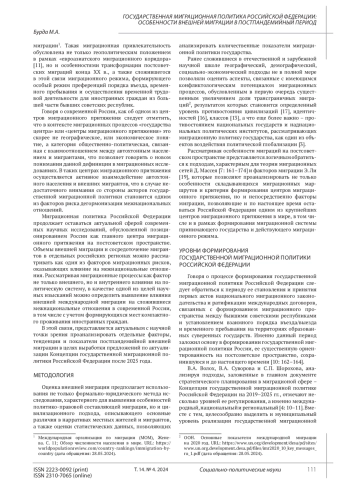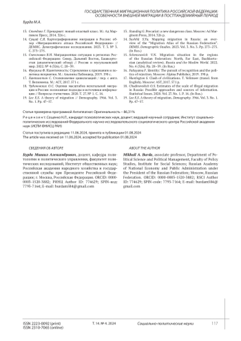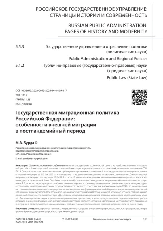 Burda M.A. Migration processes in the post-Soviet space: Russia and the features of external labor migration. Problems of the Post-Soviet Space. 2022. Vol. 9. No. 4. P. 405. (In Rus.). EDN: NNSWTN