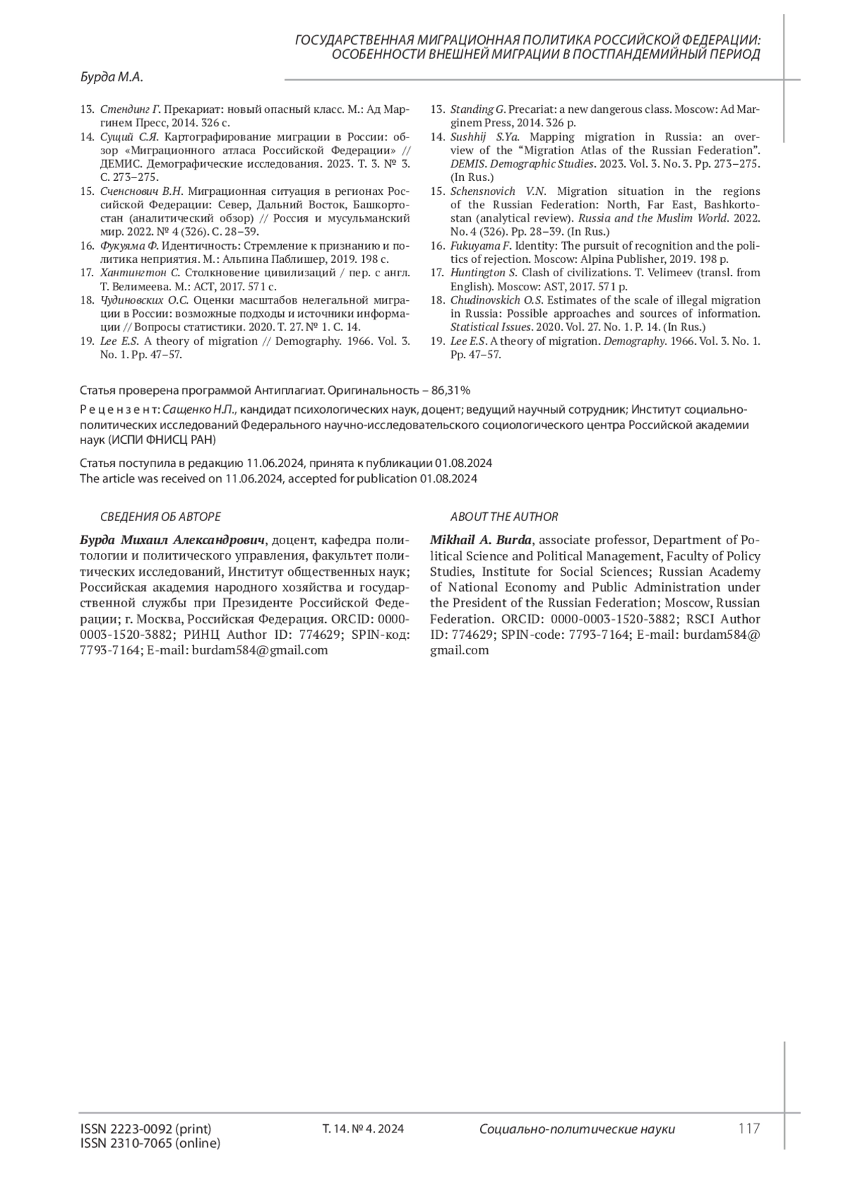 2. Бурда М.А. Миграционные процессы на постсоветском пространстве: Россия и особенности внешней трудовой миграции // Проблемы постсоветского пространства. 2022. Т. 9. № 4. С. 399-407. EDN: NNSWTN