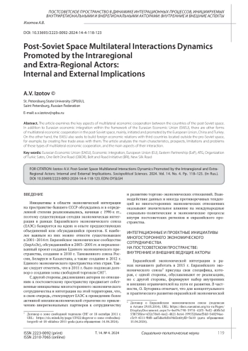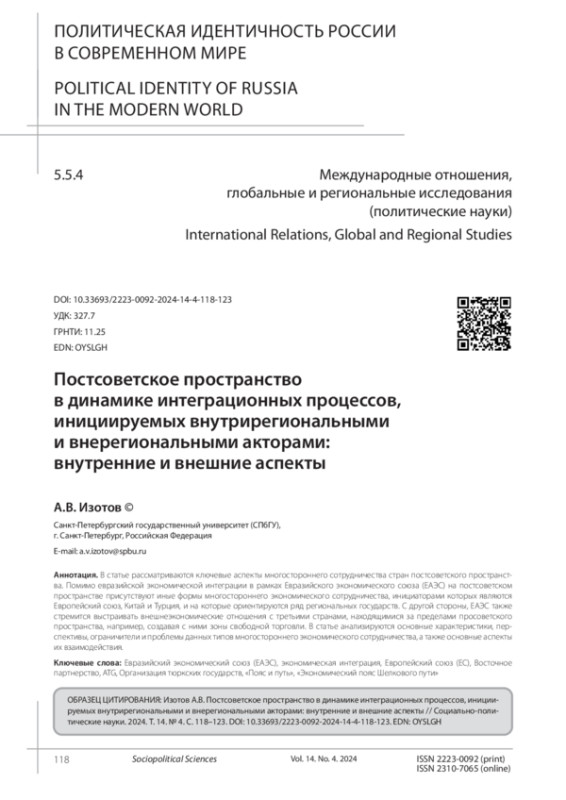 В статье рассматриваются ключевые аспекты многостороннего сотрудничества стран постсоветского пространства. Помимо евразийской экономической интеграции в рамках Евразийского экономического союза (ЕАЭС) на постсоветском пространстве присутствуют иные формы многостороннего экономического сотрудничества, инициаторами которых являются Европейский союз, Китай и Турция, и на которые ориентируются ряд региональных государств. С другой стороны, ЕАЭС также стремится выстраивать внешнеэкономические отношения с третьими странами, находящимися за пределами просоветского пространства, например, создавая с ними зоны свободной торговли. В статье анализируются основные характеристики, перспективы, ограничители и проблемы данных типов многостороннего экономического сотрудничества, а также основные аспекты их взаимодействия.