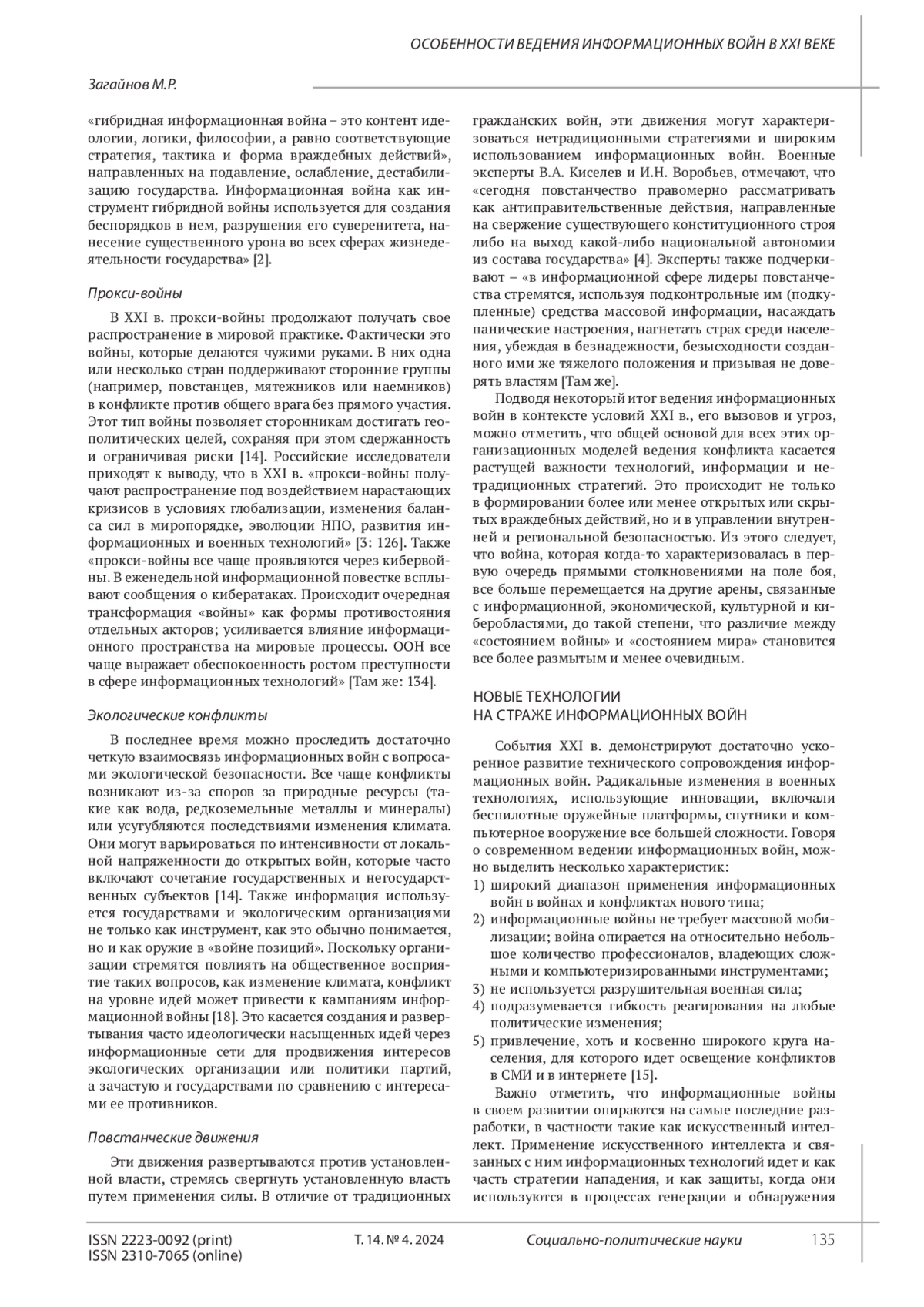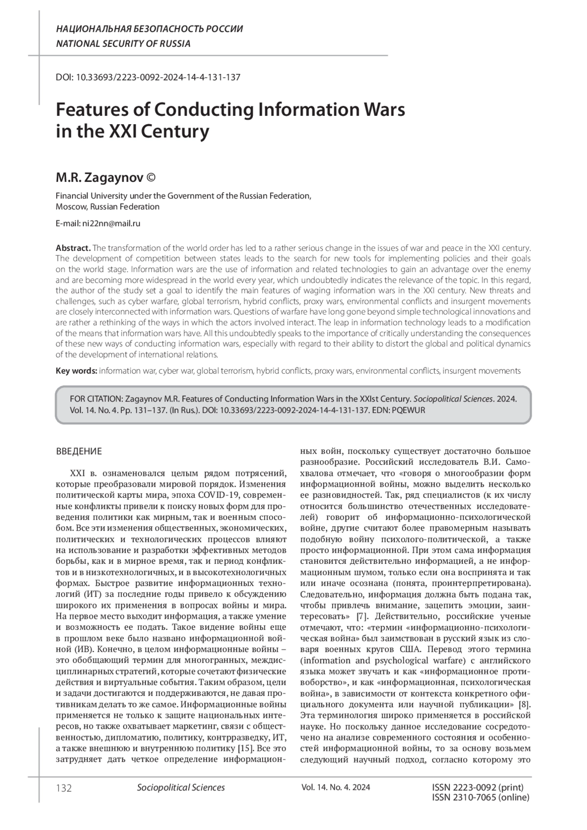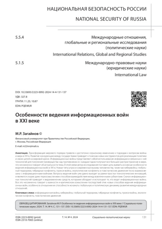 Трансформация мирового порядка привела к достаточно серьезному изменению к подходам к вопросам войны и мира в XXI в. Развитие конкуренции между государствами приводит к поискам новых инструментов для реализации политики и своих целей на мировой арене. Информационные войны представляют собой использование информации и связанных с ней технологий для получения преимущества над противником и с каждым годом получают все большее распространение в мире, что несомненно говорит об актуальности темы. В этой связи автор исследования поставил цель выявить основные особенности ведения информационных войн в XXI в. Новые типы угроз и современные вызовы человечеству, такие как кибервойна, глобальный терроризм, гибридные конфликты, прокси-войны, экологические конфликты и повстанческие движения тесно взаимосвязаны с информационными войнами. Вопросы ведения войн уже давно выходят за рамки простых технологических инноваций, и являются скорее даже переосмыслением способов взаимодействия между вовлеченными субъектами. Скачок информационных технологий приводит к видоизменению средств, которыми обладают и используют те, кто ведет информационные войны. Все это несомненно говорит о важности и критическом осмыслении последствий этих новых способов ведения информационных войн, особенно в отношении их способности искажать глобальную и политическую динамику развития международных отношений.