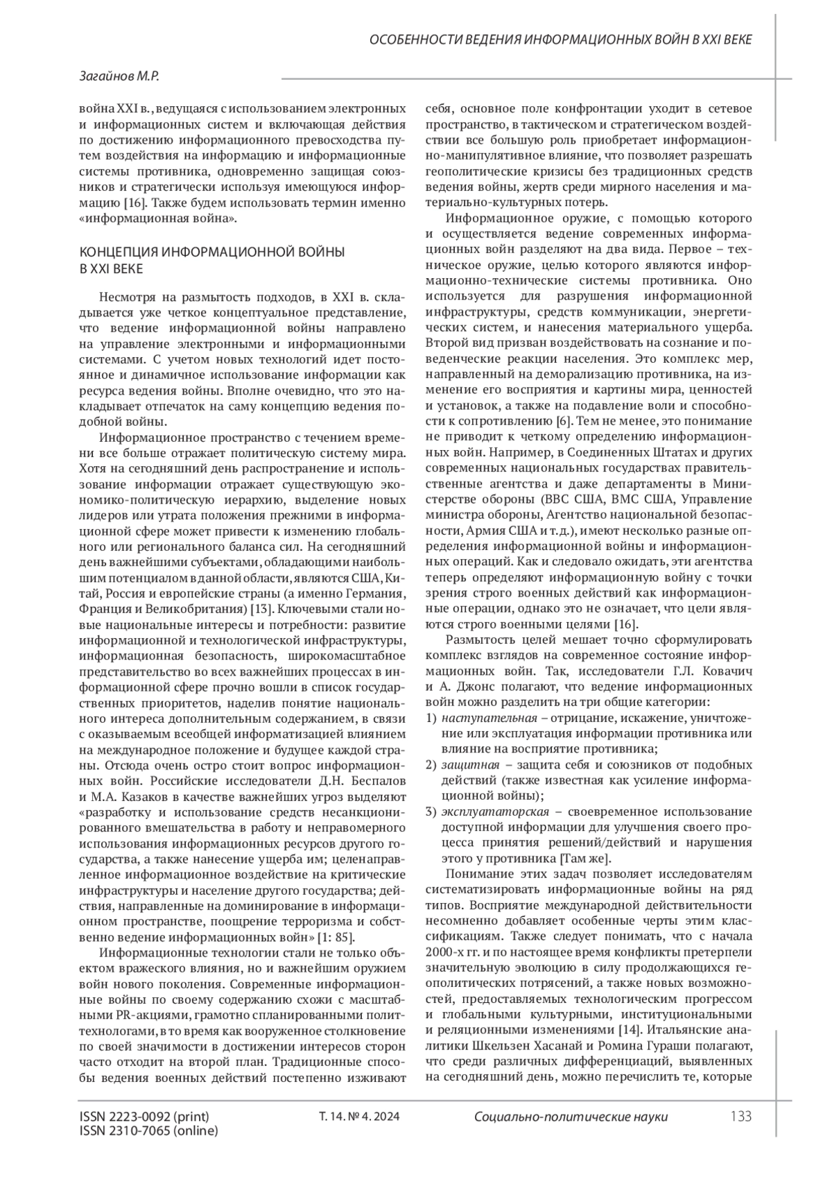 Bespalov D.N., Kazakov M.A. Information warfare and security. Bulletin of MGIMO University. 2014. No. 6. Pp. 82-87. (In Rus.). EDN: TFANIJ