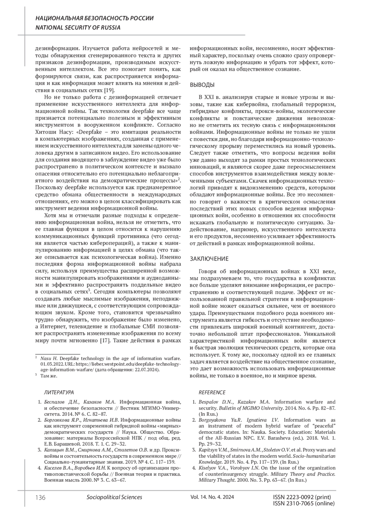 1. Беспалов Д.Н., Казаков М.А. Информационная война, и обеспечение безопасности // Вестник МГИМО-Университета. 2014. № 6. С. 82-87. EDN: TFANIJ