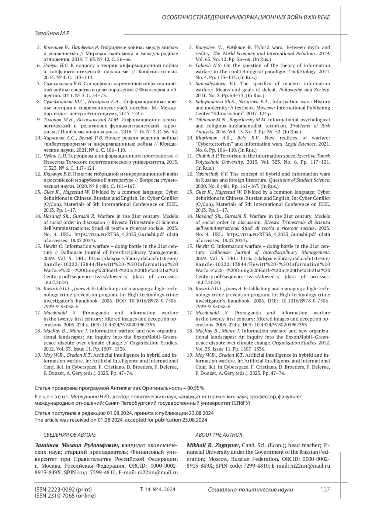 15. Hewitt O. Information warfare - doing battle in the 21st century. Dalhousie Journal of Interdisciplinary Management. 2009. Vol. 5. URL: https://dalspace.library.dal.ca/bitstream/handle/10222/13844/Hewitt%20-%20Information%20Warface%20-%20Doing%20Battle%20in%20the%2021st%20Century.pdf?sequence=1&isAllowed=y (data of accesses: 18.07.2024).